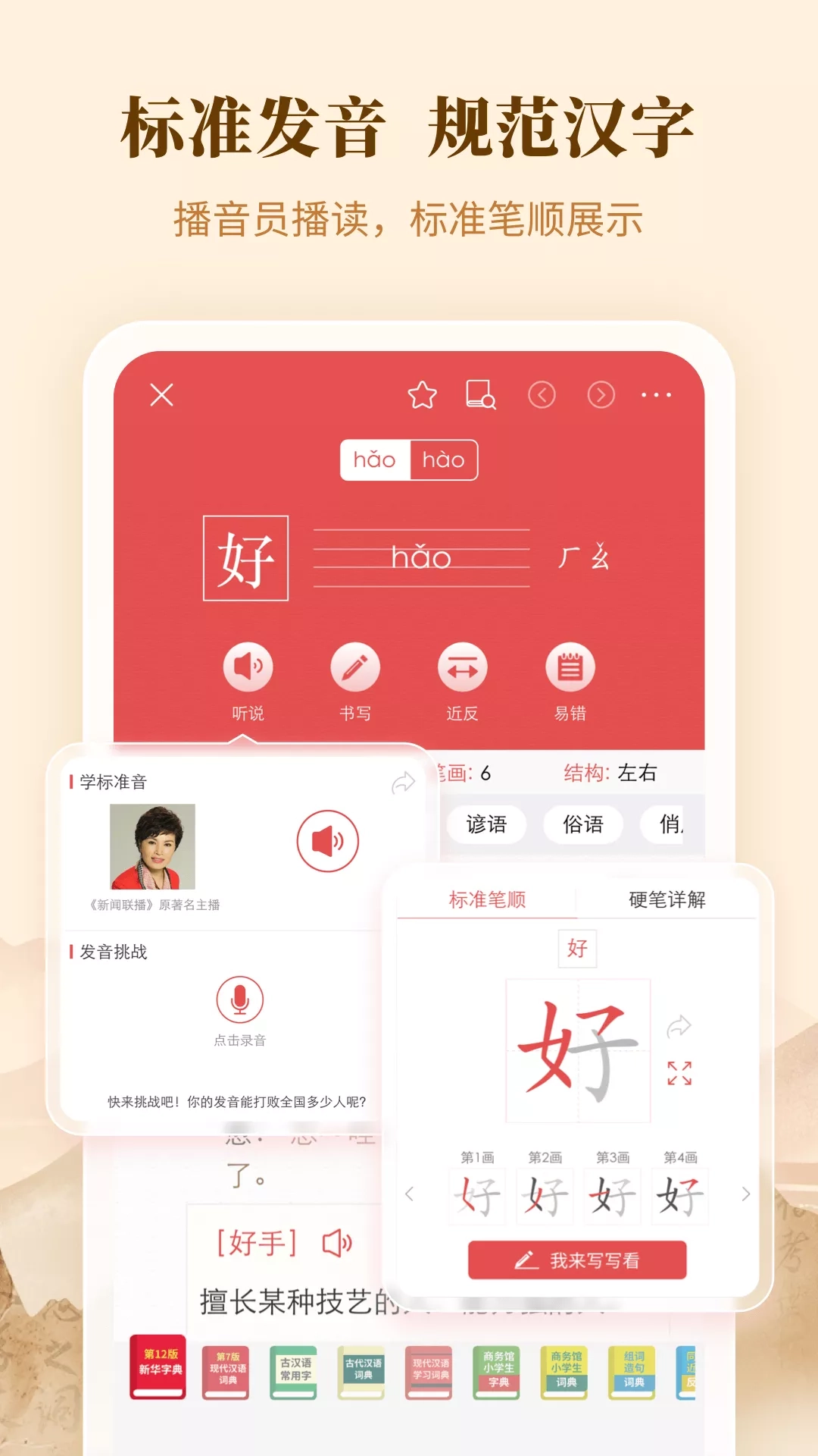 《新华字典》App,商务印书馆权威出品,中国社会科学院语言研究所编修。新增"工具书云平台"模式,收录27部权威字词典,为用户打造一站式学习助手。 ◆权威辞书知识◆ • 新中国首部现代汉语字典,汉语辞书典范之作 • 荣获第四届国家图书奖荣誉奖、第三届国家辞书奖特别奖、第三届出版政府奖图书奖提名奖 • 获“最受欢迎的字典”和“最畅销的书(定期修订)”两项吉尼斯世界纪录 • 入围数字出版精品遴选推荐计划,累计下载量超1亿次 ◆全能学习宝库◆ 【基础夯实】完整收录《新华字典》,同步纸质书更新 【拓展升级】融合《现代汉语词典》《古汉语字典》等共27部工具书 【发音规范】新闻主播标准读音,支持跟读对比练习 【书写指导】动态+静态笔顺演示,屏幕临摹更直观 【专项突破】多音字精讲+易错字汇编,扫清语文学习雷区 ◆趣味学习法宝◆ 【汉字探秘】从甲骨文到简体字,动态展示汉字千年演变 【诗词天地】精选小学初中必背古诗,配套赏析注解 【闯关游戏】字词接龙/成语挑战/古汉语挑战,边玩边学 【每日打卡】易错字提醒+组词接龙+成语解密,5分钟轻松积累 ◆智能查词利器◆ 【纸书联动】扫码即查纸质书生字,笔顺动画秒加载 【多模检索】支持语音输入、手写识别、拼音、部首等多种查词方式 【学习管理】云生字本自动同步,支持个性化分类收藏 【智能助手】实时解答语文知识,推荐近反义词辨析 日新无已,望如朝曙,自上线以来,《新华字典》App不断丰富内容,提供了数十项增值服务,荣获诸多奖项,全面提升了“国典”品牌价值。 《新华字典》App,随时伴你身旁的“良师益友”。
