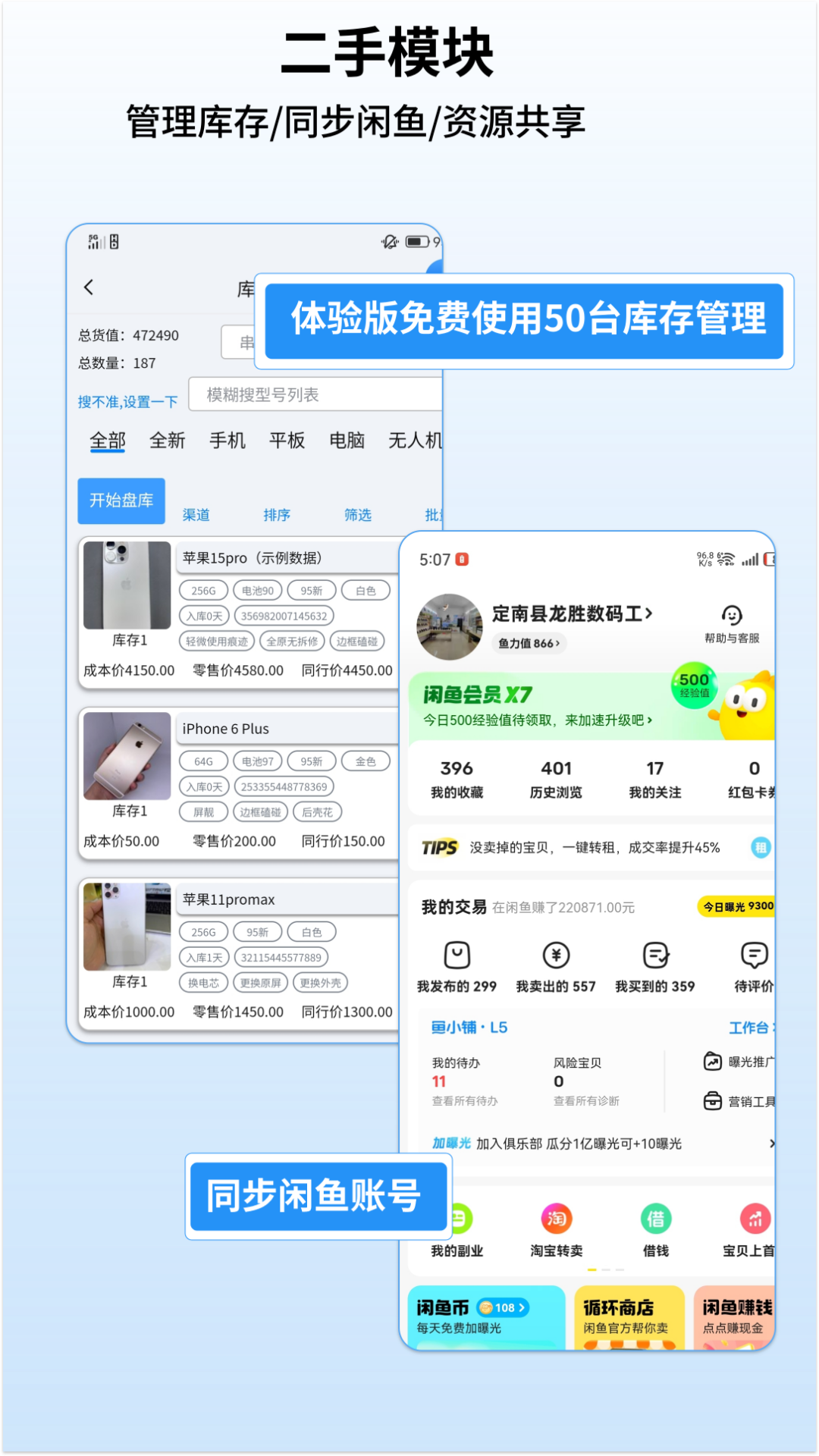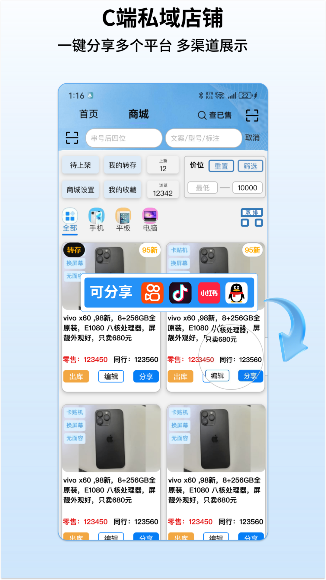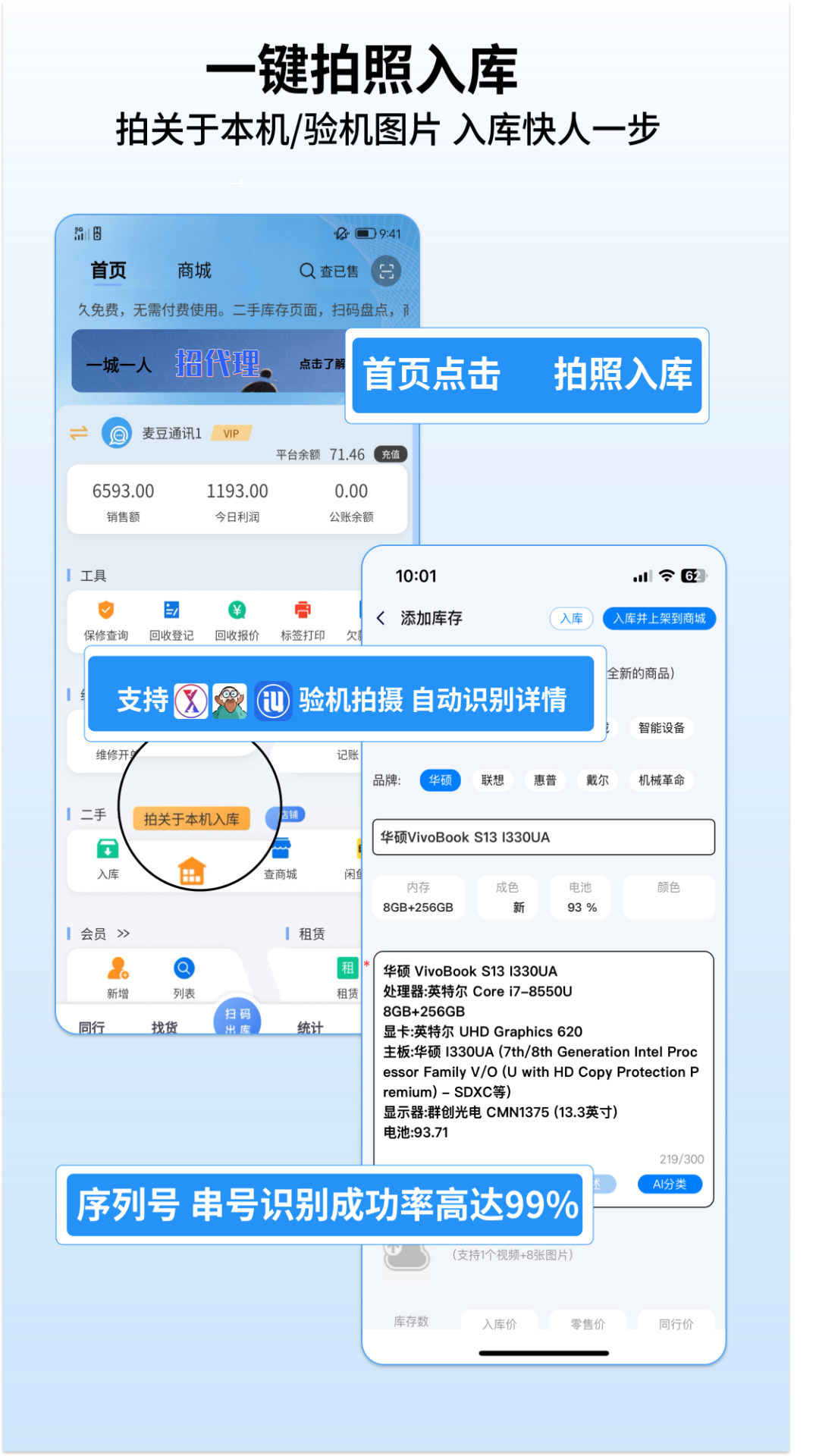 通讯邦是一款定位管理二手店铺的APP,软件内包包括以下模块: 1,二手管理 主要优势在于管理二手手机,电脑,等数码产品。对奢侈品,全新机管理也有很好的优势。可以一键将管理的商品进行分享给他人。AI加持拍照就能识别要入库的商品并智能归类。 2,配件管理与内配批发 内配一般指维修配件用的配件,支持批量导入与拍照识别型号录入、支持将库存配件分享给他人,支持在线查看库存商品信息,价格在线下单。 3,维修管理 超级灵活,简单易用。登记开单仅需30秒即可完成。 4,会员次卡 上团购,做活动,经营私域离不开会员管理。本模块支持次卡核销,会员储值,积分累计,单词消费登记,消费短信发送,扫码注册。公众号推送。 5,收支记账 能实时查看账上有多少钱,今天入账多少钱,支出多少钱,会进行汇总。 6,回收登记 登记回收人身份信息,支持人脸与身份证号的匹配。 7,标签打印 日常经营中很多地方需要使用标签标注注意事项,我们的WIFI打印机支持多设备的共享打印,日常使用方便快捷 8,查询数码产品的保修日期,查看数码产品的回收价格。 9,更多实用功能等您体验。 电子邮箱:519644295@qq.com 电话:07974291213