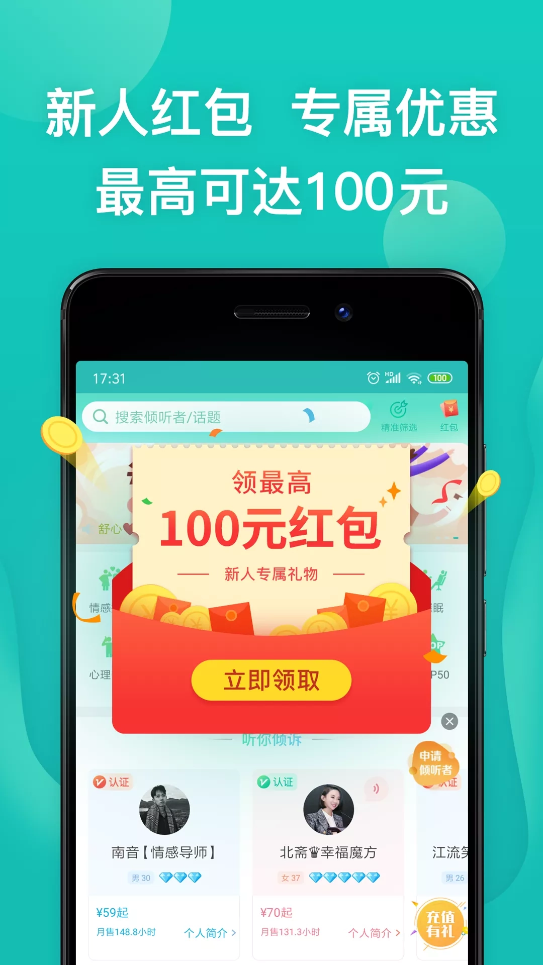 服务全球超过86个国家的1对1匿名咨询平台,中国领先的移动互助应用。松果倾诉提供情感、恋爱、婚姻、家庭、心理、校园、职场、生活、亲子等问题咨询服务,超过10万精英倾听者:情感咨询师、婚姻家庭咨询师、心理咨询师、职业规划师、催眠师、律师、海归、创业者、优秀在校生、辣妈、教育达人、同性友人、超百种行业人士等各种背景过来人,总有一个能帮你! 【隐私安全】1对1匿名倾诉,无须注册,文字通话不留痕迹,还支持通话变声哦。 【实时高效】7*24小时真人在线,随时随地,想说就说,想问就问。 【实力认证】超过10万精英倾听者,放心说心事! 【交流方式多样】文字、图片、语音、实时通话、在线视频,“全方位”的专业服务,面对面的感觉,让您身临其境。 【温馨社区】除1对1匿名倾诉外,还有求助广场、心情分享、公开课、群组、视频课堂、各种福利活动。 找朋友倾诉,不如找松果倾诉! 【打开APP领红包,最高100元】 使用过程中有任何问题,请联系我们: 客服电话:400-633-6659 邮箱: app@51songguo.com