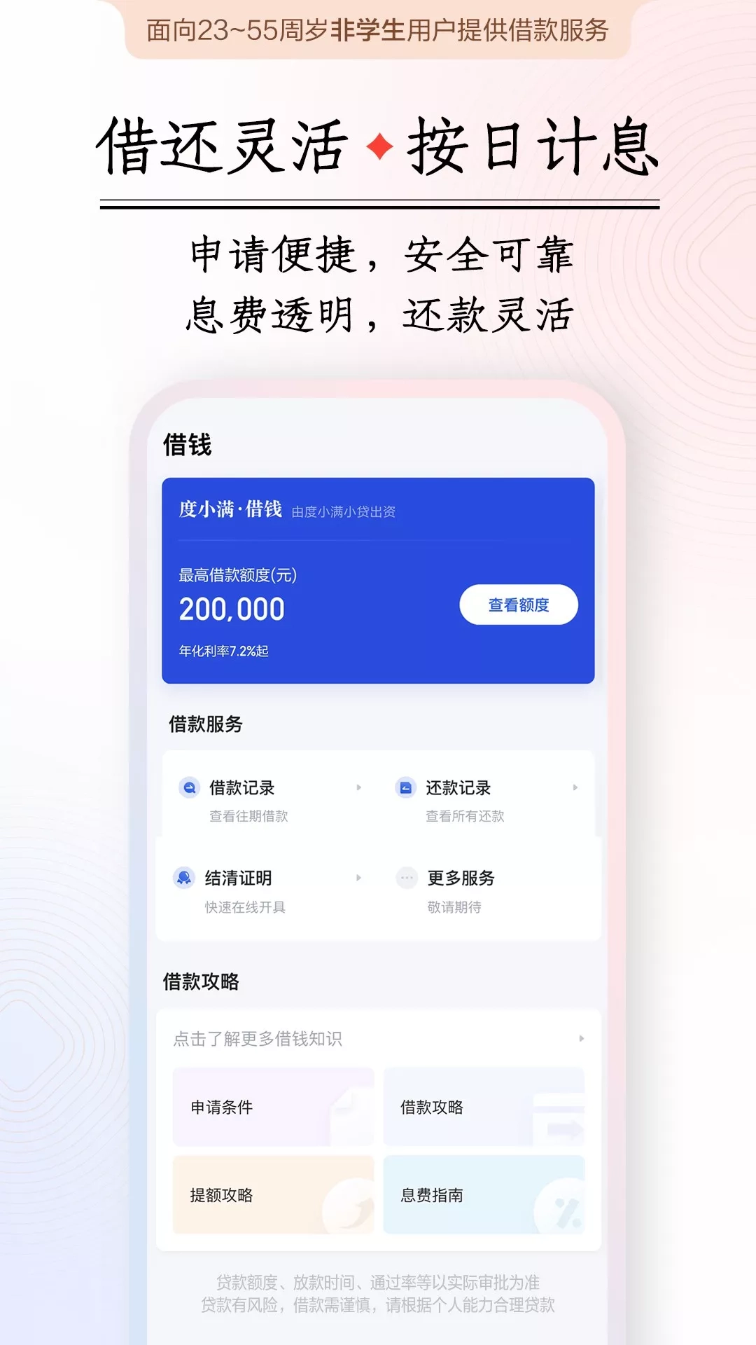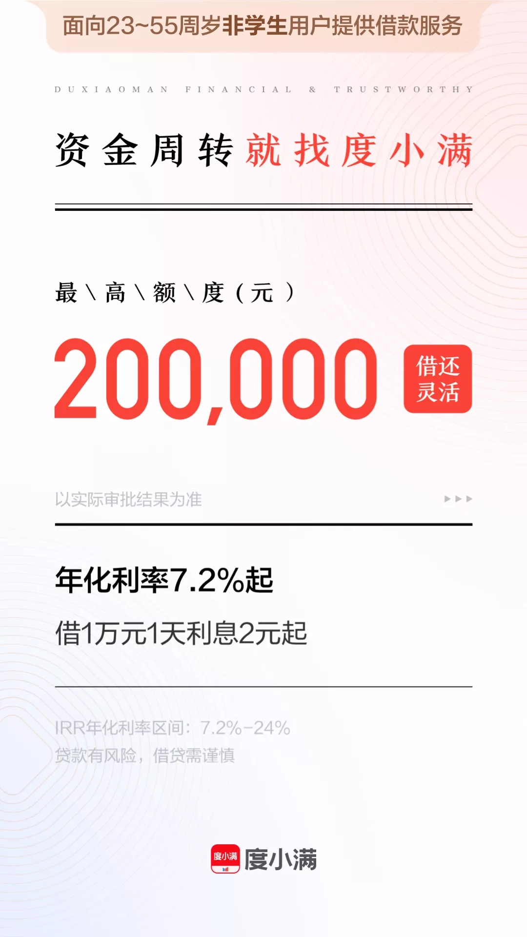 度小满是综合类金融服务平台,面向大众提供互联网信贷服务、优质的基金销售服务和安心的保险服务。度小满持有多种牌照,并与数百家银行,持牌金融机构达成合作,在信贷、理财、保险、支付等领域为用户提供值得信赖的金融服务。资金周转就找度小满! 【度小满 借钱】 度小满利用人工智能和大数据风控技术,为用户提供方便、快捷、安心的借款服务。 产品特点: 1.贷款额度高:最高额度 20万元; 2.息费透明:年化利率7.2%起,借1万元利息一天2元起,年化利率区间7.2%-24%; 3.操作便捷,借还灵活:在线申请,支持多种还款方式,最长可分12期慢慢还; 4.安全借款:个人信息全程加密,为您提供全程保护。 【理财】 甄选持牌金融机构,严格筛选金融产品,覆盖多种金融产品种类,满足不同期限、不同风险偏好的投资需求。 资金安全有保障:领先的研发技术团队,打造严密风控体系。 【保险】 精选保险产品:涵盖重疾险、医疗险、意外险、寿险、年金险、财产险,多方面保障服务; 1V1专属服务:资深保险经纪顾问一对一指导,测需求、做方案、挑产品,全流程贴心服务。 温馨提示: 借贷有风险,选择需谨慎。具体贷款利率、额度、期限以实际审批为准年化利率区间7.2%-24%,资金来源:重庆度小满小额贷款有限公司及合作金融机构。