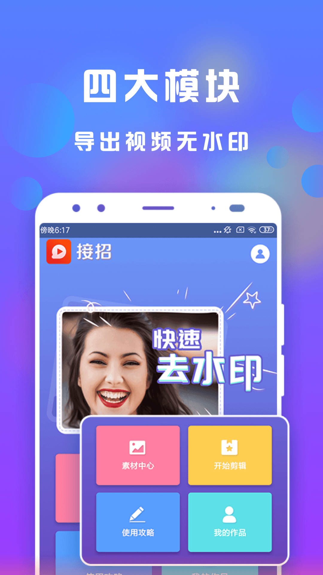 接招 - 视频剪辑大师,轻松打造您的短视频作品! 【产品特性】 接招是一款强大的视频剪辑和编辑工具,专为满足您的短视频制作需求而设计。内置多种视频制作工具,让您脱颖而出,分享您的故事。 轻松管理您的自拍、热门、高清、娱乐、亲子、教学、课程、卡点等各类视频。丰富的视频剪辑功能包括旋转、切割、添加文字和贴图、马赛克、合成、压缩、任意尺寸等,让您随意驰骋创意。 新增视频转GIF功能,让您将精彩瞬间轻松制作成生动的GIF动画,做出令朋友们耳目一新的表情包。 无水印导出,呈现清晰画面;一键分享至微信、朋友圈、微博等社交平台,和好友一起分享您的短视频作品。同时,应用支持高清视频导出,让您的作品更加出彩。 编辑后的视频可自由进行本地分类管理,方便轻松查找:音乐相册、MV、广场舞、游戏、美女、亲子、搞笑、街拍、Vlog等各类精彩内容应有尽有。 接招 - 您的视频剪辑神器,让您轻松打造独一无二的短视频作品!创意无限,尽在接招! 【我们期待您的使用反馈】 功能使用如有疑问请您及时反馈我们: 客服联系方式: 微信号:takethatfun QQ号 :3208302934 接招粉丝交流群: QQ群号:57687965 新浪微博:@接招视频剪辑app 微信公众号:接招剪辑APP