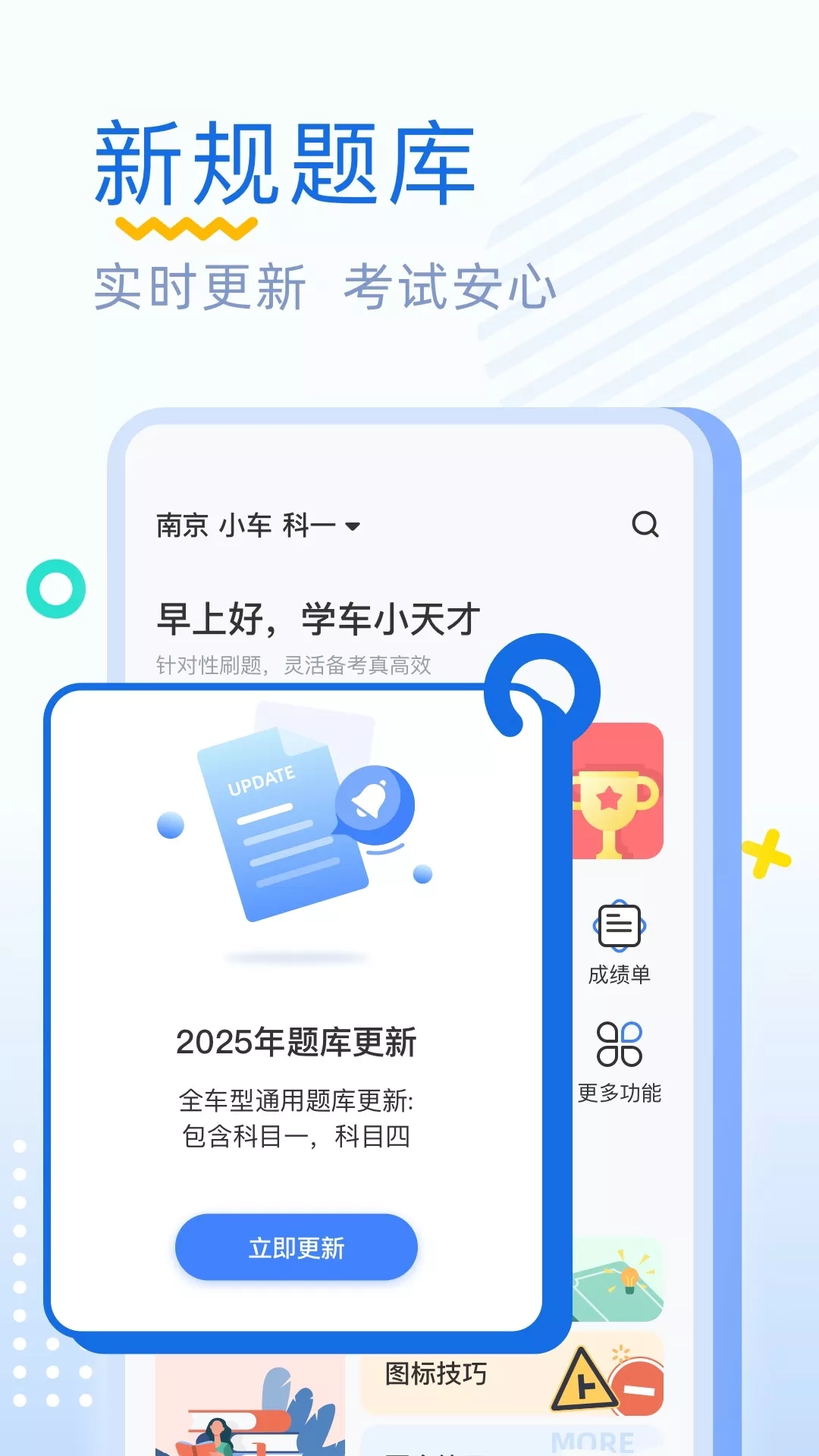安心驾考同步更新全车型驾考科目一、科目四理论考试题库,还有科目二科目三操作视频等内容。提供小车、货车、客车、摩托车等全车型考试题库,覆盖完整学车流程,从科一到科四,一路顺利考驾照。讲师讲解驾照考试技巧,通过科学有效学习方法,助力学员掌握驾照理论考试知识,是一款不错的驾驶员模拟考试练习软件!