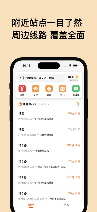 敬告 :本APP非官方的APP,是个人为了查询方便而制作的APP。 此APP为草根APP,是个人爱好开发。 让您轻松查公交的实时位置,公交到哪了,公交还有几站到。手机变身公交电子站牌,随身移动。 ——【优势】—— 1.支持收藏你关心的线路。 2.支持实时查看公交车走到哪里。 3.支持查看短线信息。 4.支持羊城通余额在线查询和NFC读取实时余额。 5.支持羊城通余额不足提醒。 6.支持收藏的线路生成快捷方式放到桌面。 7.支持下车提醒。 8.支持多线路对比。 9.支持路线规划。 10.操作简便,信息详尽,极简风格,清新自然。