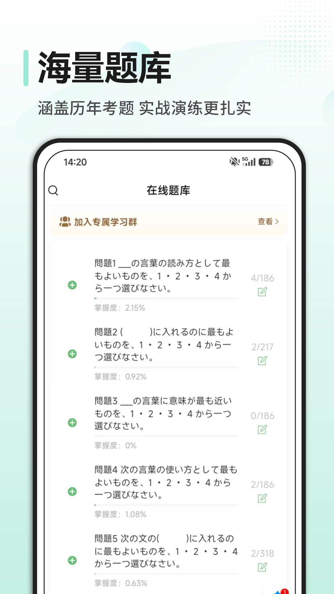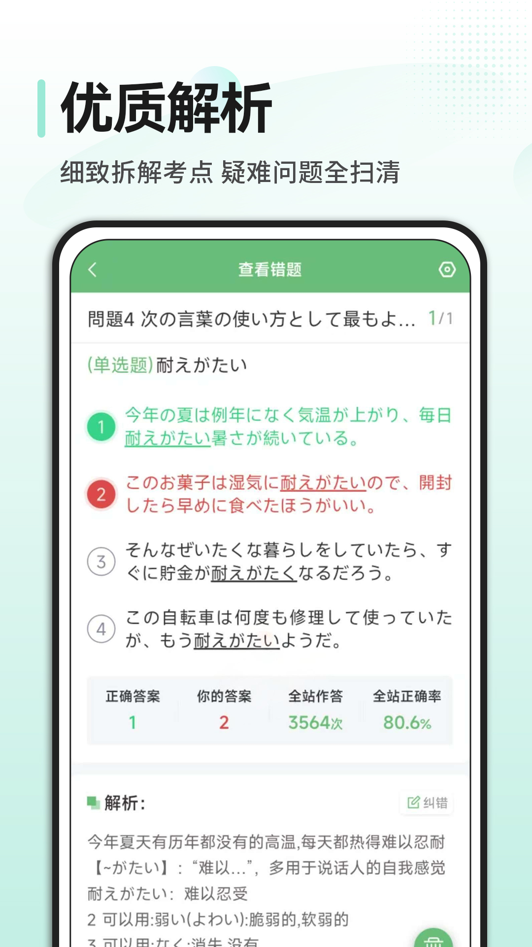 「天気がいいから、散歩しましょう。」<br><br>纳豆日语题库共计收录JLPT日语能力考、考研日语、高考日语等8000+道真题、模拟试题,由纳豆日语研究中心专家团队编写答案详解,一题一解析。听力题配有日语原文。<br><br>支持单词、语法、阅读、听力的专项训练、打卡闯关、随机练习、实战演练等不同刷题模式,目前已有5000+考生在线刷题!<br><br>有了它,备考的你不仅可以固定时间打卡、模拟训练,还能利用等公交、坐地铁等碎片化时间在线刷题,助你轻松散步!<br><br>题库特色:<br><br>三大刷题模式<br><br>专项训练:单词|语法|阅读|听力,四大专项,逐个击破<br>随机练习:打乱顺序,随机刷题,培养做题手感<br>实战演练:选题组卷,定时定量,体验考试氛围<br><br>四大备考题库<br><br>JLPT历年真题:16套历年真题,掌握出题方向<br>JLPT全真模拟:五套全真模拟,直击常考重点<br>JLPT单词模拟:N1 900题、N2 720题刷题冲刺<br>JLPT易错题库:N1N2正确率低于60%试题合集<br><br>九大助力功能<br><br>错题集:自动收录,查漏补缺<br>一题一解:精华版解析点破考点<br>练习历史:温故知新,有迹可循<br>我的收藏:好题难题,一键收藏<br>我的笔记:整理考点,以便复习<br>打卡闯关:两种模式,每日打卡检测<br>每日一练:生成报告,检测备考成果<br>全站正确率:辅助判断试题重难点<br><br>在纳豆题库,和5000+考生一起在线刷题<br><br>意见反馈:<br>riyubao@163.com