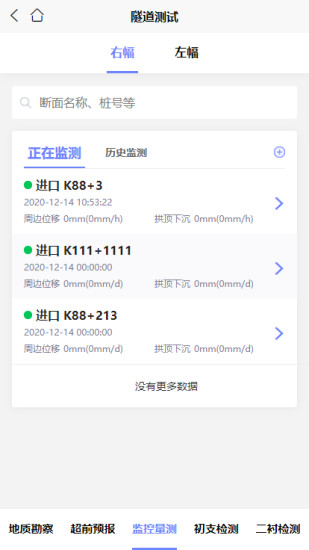 隧道检测移动系统主要由监控量测、超前预报、地质勘察、质量检测四大大关键部分组成。用户通过本息可快速便捷的掌握隧道的安全状况、施工进度等信息。 1、隧道地质勘查 利用手机端查看隧道的地质勘查图,了解该隧道的地质围岩级别,从而是隧道管理员能够准确的预判隧道施工进度所需要注意的地质围岩,积水情况。 2、自动监控量测 利用自动监控设备实时上报隧道各段累计位移、位移速度以及位移加速度,同时提供app端人工断面监测,自动监控量测设备的添加,并利用相关的数据进行数据分析以及位移的趋势预测等。 3、隧道施工风险提示 结合自动监测数据以及隧道施工掌子面推进进度,利用邮件,短信等方式进行隧道施工安全预警提醒。即时提示施工安全管理人员对相关情况进行进一步的追踪与危险排查。 4、初支和二衬数据的更新填报 对初支和二衬的相关数据进行移动端填报以及相关数据的查看,从而使得项目指挥部能够根据填报的内容了解该隧道的具体施工进度。 5、超前预报 利用隧道超前预报方法,通过GPR和地震波反射法(T3)对即将开挖隧道进行地质预报,进而了解即将隧道的具体围岩级别判定等级(1-5级),地下水情况。