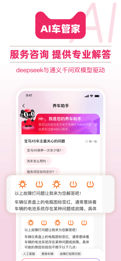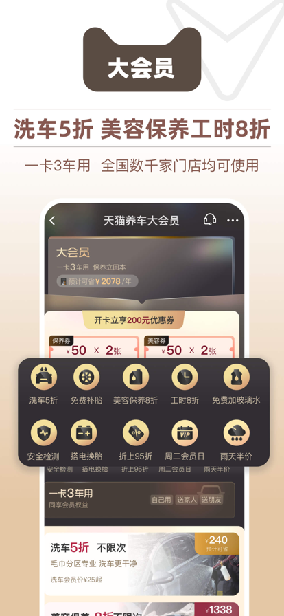 目前全国已有2000多家天猫养车门店,以标准、透明、有保障的理念为逾千万车主提供维修、保养、洗车、美容、轮胎、搭电、上门安装电瓶、改装、贴膜、钣金喷漆等服务。 【新人红包】 新用户下载注册可领380元超值券包,单项最高可减100元! 【AI直播】 天猫养车全新AI直播功能,搭载阿里云和达摩院AI算法,精准识别施工进度,车主可以随时在APP查看施工过程,不必亲自守在车前;AI直播录像保留30天,服务完成后也能查看回放视频。 【预约排队】 APP在线下单后即可预约服务门店和服务时间,预约到店可减少等待时间。到店后扫码签到,可在APP查看排队进度,不必担心被插队。 【智慧养车】 天猫养车智慧系统掌握98%主流车型的原厂保养数据,精准推荐适配保养方案,使用材料和项目工时透明;服务进度实时提醒,服务明细一目了然,服务报告随时查看。 根据40项车况明细数据及原厂保养标准,智能提醒车辆隐患及解决方案,不用再翻保养手册,不必担心过度保养。