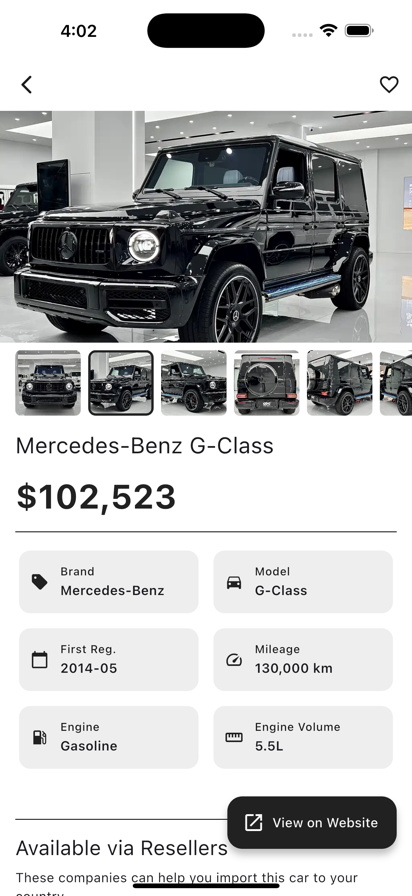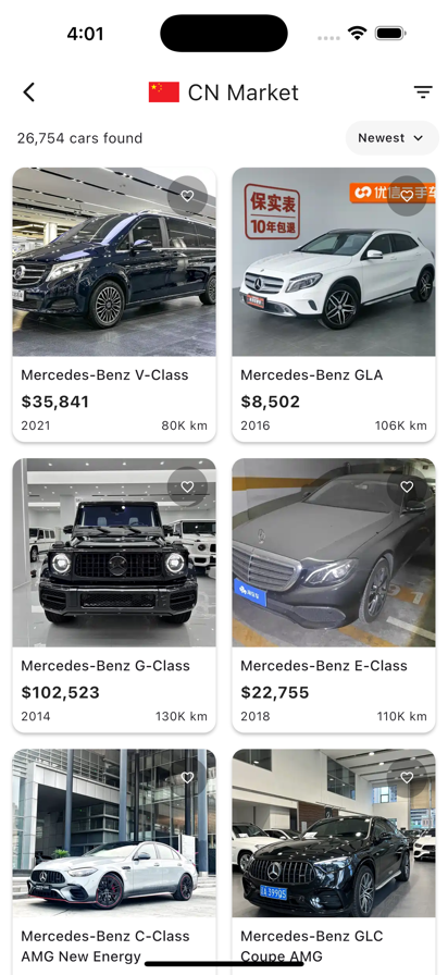 全球找车、比较、联系车商获取新车与二手车——您的全能汽车资讯与目录平台。 探索全球车源 在一个应用中浏览来自欧洲、中国和韩国的数百万车源。 无论是宝马、奔驰、奥迪、特斯拉、比亚迪、蔚来、小鹏、现代、起亚,还是超级跑车与电动车,「全球搜车」都能帮您找到理想座驾。 为什么选择全球搜车 • 全球车源聚合:来自欧洲、中国、韩国的优质车源。 • 即时比较与联系:新车、二手车、电动车、SUV、跑车应有尽有。 • 实时汇率换算:即时查看本地货币价格。 • 可信经销商:全部车源信息透明,安全可靠。 • 智能搜索与收藏:保存、比较、跟踪喜欢的车型。 核心功能 全球汽车目录 支持品牌搜索、价格筛选、车龄、续航里程、燃料类型等多条件组合,让找车更精准。 高级筛选系统 快速找到您想要的车:电动车、SUV、豪华车、家用车等。 经销商联系与国际协助 可直接联系卖家,或对接合作伙伴以获取物流、关税及检验等出口协助。 个人车库 收藏并比较不同车辆,随时查看最新价格与库存变化。 立即下载「全球搜车: 查找二手车与新车」,开启全球选车新时代。 下一辆梦想座驾,只需一次搜索。