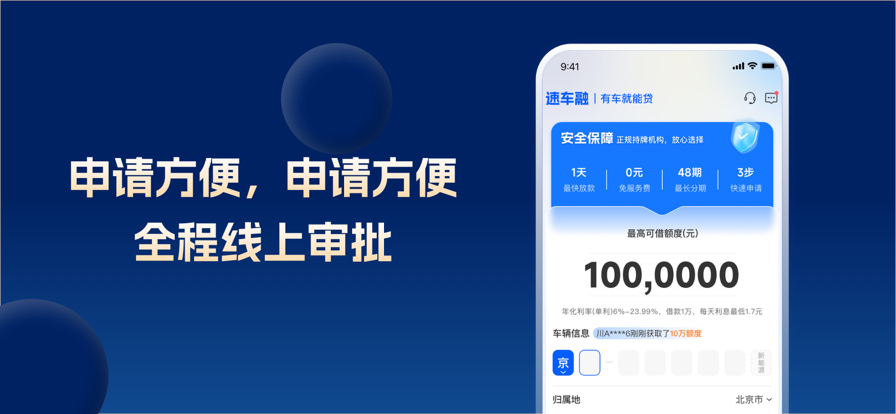 合规贷款提供平台,车主专享,不押车,钱到手,车照开! 速车融致力于以智能科技驱动,为广大车主提供更专业安全、高效的金融数据化借贷服务。申请简单,全程手机操作;仅需3步,快至当天放款,年化利率6%-23.99%(单利);可申请大额备用金,满足您生活中日常消费/创业启动/资金周转等各大场景用钱需求。 【额度】可借额度高至100万,通过率高 【利息】综合年化利率(单利)低至6%起 【分期】支持6-36个月超长贷,还款无压力 【便捷】线上申请,流程简短,全程手机操作,简单方便 【放款】至快当天放款到账 【不押车】钱拿走,车照开 合规平台,息费透明 个人信息全程加密,多重隐私保护