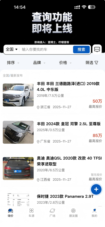 询询车,专业的全国性二手车B2B交易平台,以数字化技术赋能车商转型升级,助力实现智能高效经营。平台整合全国海量优质车源,让找车、收车、卖车更轻松便捷。 依托平台强大的资源整合能力,我们提供一站式服务:精准车况查询与权威鉴定,保障交易透明;安全交易担保,护航资金安全;便捷管理,轻松实现线上运营。 询询车始终秉持诚信经营理念,致力于打造高品质二手车交易平台,为车商伙伴提供更安心、更优质的交易体验。