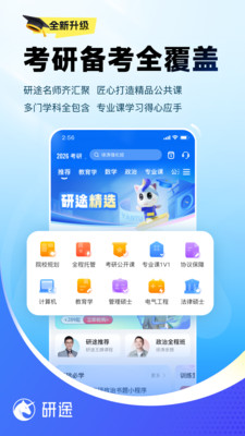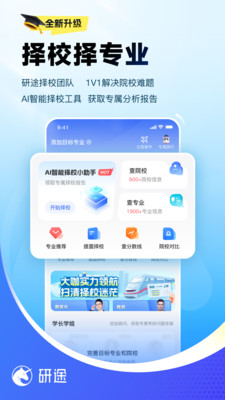 考研院校专业以及公共课学习平台 研途考研APP是研途教育旗下的一款针对考研备考专用的学习软件,专注于为考研学子提供一站式考研备考学习平台,APP内囊括了院校规划指导、考研政治、数学、英语及专业课等名师在线直播课程和内容详实的精品录播课,并提供配套优质学习资料,满足全日制考研、在职考研、艺术考研、MBA考研等不同学子的备考需求。 【名师领航】 政治徐涛、曲艺;英语屠皓民、唐迟;数学杨超领航的名师团队为芊芊学子的考研备考保驾护航。 【新人礼包】 注册可领专属定制新人礼包,超多好课等你来听.更有实物礼包等你来拿。 【1V1定制课】 精准匹配专业顾问,定制专属学习计划,提供从初试到复试的全方位备考指导。 【考研题库】 50000+全科精选试题,历年真题、考点刷题、错题集等功能上线,各类习题一网打尽。 【入门必听好课】 不定期更新各科免费公开课,更有名师直播帮你逐一击破考研路上的难题,带你从新手小白到有目标不迷茫的考研人。 【每日刷题】 公共课刷题小程序带你每日复习考点;考点刷题模块,紧跟热点,不断更新你的知识库;历年真题模块,往年真题随心刷,掌握题型拿高分。 【线上模考】 万人线上模考,基于当年考研大纲,线上模拟真实考研环境,依据考研阅卷评分规则智能批改,复习情况一目了然。 联系我们 官方抖音:研途考研官方号 官方网站:https://www.kaoyanvip.cn/ 官方微博:研途考研教育VIP 微信公众号;研途考研服务号 咨询热线:400-9158-585