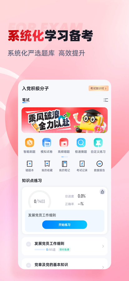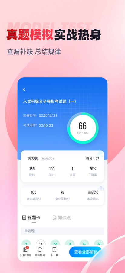 入党积极分子考试聚题库——专业备考 系统学习 助力思想理论提升 备战入党积极分子培训结业考试?入党积极分子考试聚题库是您专业可靠的学习助手。我们提供权威精准的学习资源,助您系统掌握党的理论知识,全面提升政治素养。 真题模拟实战演练 应用内精选汇集各地培训考试真题及高质量模拟试卷,严格依据最新培训大纲精心编写。通过模拟考试功能,您可体验真实考场环境,进行全真限时测试。考试结束后,系统即时生成详细分析报告,清晰展示您在党的基本知识、党史、党章、时事政策等各模块的掌握情况。智能评估系统精准定位知识薄弱环节,帮助您明确学习重点和改进方向。 系统化知识点练习 我们依据培训要求将知识点科学分类,涵盖党的基本理论、党史重要事件、党章基本内容、党的纪律处分条例、最新时事政策、中国特色社会主义理论等核心内容。每个知识点模块都配有专项练习题和详细解析,帮助您深入理解党的理论知识。您可以根据学习进度选择对应章节练习,巩固理论基础,掌握重点难点。 入党积极分子考试聚题库集权威真题模拟与系统知识点练习于一体,设计科学,操作便捷。通过反复的学习训练,帮助您夯实理论基础,提升政治素养。应用内容持续更新,紧跟最新理论发展和政策要求,是您备考复习、查漏补缺、提升通过率的专业工具。立即下载应用,开启系统学习之旅,为成为一名合格的入党积极分子奠定坚实基础。