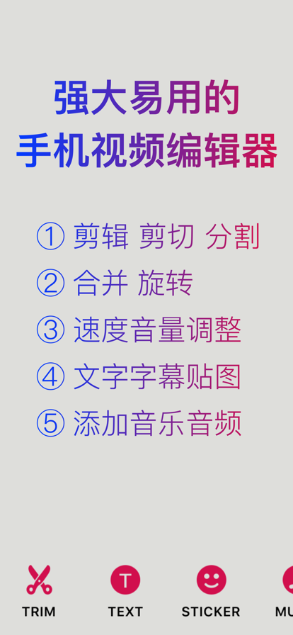 可能是中国最良心的专业手机视频剪辑工具 背景音乐/滤镜/快慢放/表情/文字/截图/分身 视频剪辑 + 裁剪视频 + 删除视频中间部分 + 视频截图 + 合并视频 + 调节视频速度 + 旋转视频 + 调整视频尺寸 音乐视频 + 内置流行背景音乐 + 时间轴同步音频与视频 表情和文字 + 制作视频字幕 + 时间轴控制文字和表情 + 丰富的文字表情库,任君选择 滤镜/快慢放 + 内置丰富视频滤镜可选,一键制作大片 + 灵活调整视频快慢