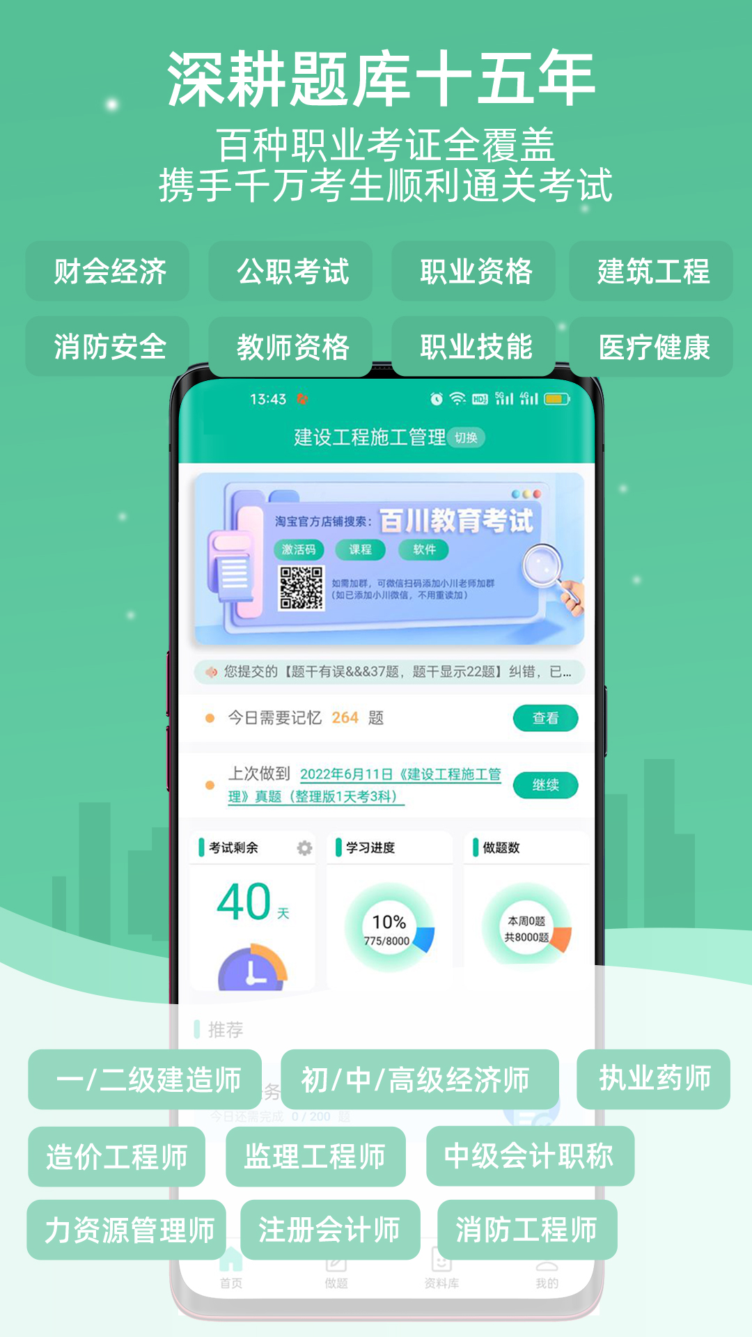 百川超级学霸是一款全方位服务考证学习的手机应用,帮助考生轻松通过考试 <br> <br>题库中包含【章节练习】【精选题库】【母题】【强化题】【模拟考试】【历年真题】【预测试卷】【考前押题】等,还拥有许多强大智能学习功能。 <br> <br>1.章节练习——配套官方章节练习,全解析,共享笔记,标注不同版本教材的知识点对应页码,无需频繁更换教材,知识点轻松记忆,多个考点逐一击破。 <br> <br>2.模拟考试——全面的历年真题卷,直击薄弱点的模拟试卷,含金量十足的预测试卷。多方位出题,轻松掌握常考点,易考点,让大家适应考试氛围,了解考试难度。 <br> <br>3.错题复习——将正确率做到80%,大大提高通过率。独有的艾宾浩斯记忆曲线防止遗忘,个人错题管理,全网云错题,更精准的知道自己的混淆点,薄弱点。 <br> <br>4.连对挑战——章节练习题目数量大于80%后,开启隐藏游戏连对挑战。连对挑战有七个等级,青铜<白银<黄金<铂金<钻石<星耀<王者,挑战成功后考试通关率90% <br> <br>5.海量资料库——名师考点,学霸笔记,经典资料问答,记住这些,提高三十分不是问题 <br> <br>6.考前密押——考前15/7/3天,高价值独家密押免费送,助你成功通过考试。 <br> <br>题库实时更新,更多考试资源请关注 <br>微信公众号【百川超级学霸】