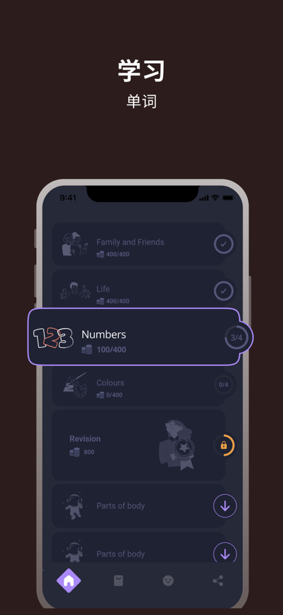 本自修教材,由使用配音和配图支持下,保证学习者掌握好外语的标准发音及外语的正字法。为了正确组织学习过程,将有助于“Smart-Teacher”功能。靠此帮助下,您或您的孩子可以以有趣的游戏形式学到外语的新词,增加词汇量,完善外语口语及书面语的水平基础。每天自学可以提高你的实践知识 – 阅读,口语,聆听,素养。这包括文字超过40种语言,翻译。 便于学者方便,本教材分为个别阶段: - 训练 - 记忆锻炼:字母表、名词、形容词、动词等,附加带音标及声音的卡 以及语言使用者高质量的配音。 - 使用以开心又轻松,并容易理解的游戏形式作为对于掌握词汇的参考: * 对图片选择正确答案(单词)。 * 使用词汇表选择相对的移动图片(正确答案)。 * 写单词和正字法测试。 此游戏是极有趣的又对个人有发展游戏,也就是学初级的外语发音及词汇量自学者的一种“电子家教”。 专题列表: 乐器, 人们, 人体部位, 介词, 信息技术, 冬季运动, 几何形状, 办公室, 动物身体部位, 厨房用具, 商店, 基础设施, 夏季运动, 大自然, 学校, 家庭内部, 家用电器, 工具, 房子, 数字, 文具, 旅游, 昆虫, 服装, 水果, 洗澡间, 海洋生物, 游戏, 玩具, 社会, 职业,自然现象, 蔬菜, 运动, 运输工具, 野生动物, 鞋子和配件, 颜色, 食品, 饲养动物, 鸟类 。