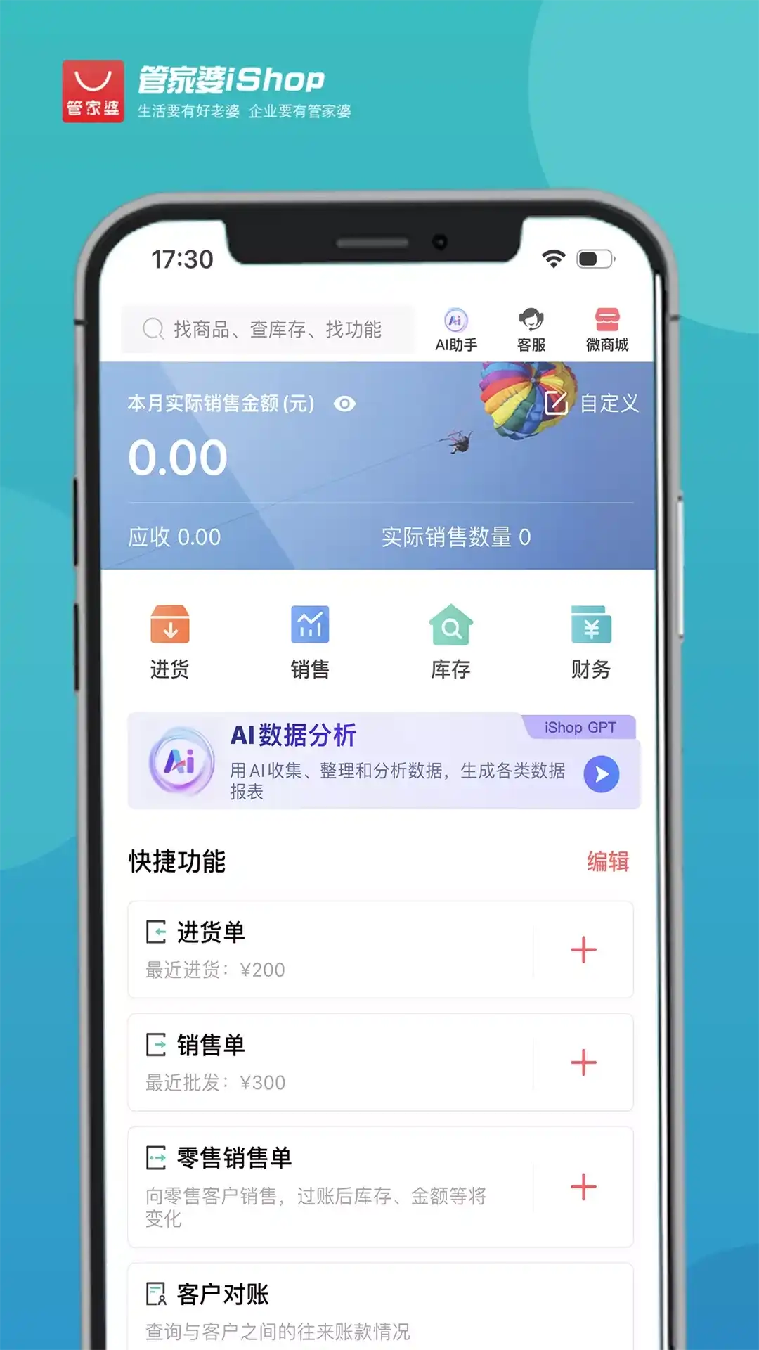 管家婆手机版,为中小微商贸企业量身打造,提供一站式移动进销存管理解决方案。该产品融合了SaaS、BI和前沿AI技术,通过多操作终端(手机、电脑、平板、PDA、POS等),实现高效、智能的管理。 【适用对象】 专为批发、零售、批零兼营等业态打造,覆盖了食品行业、服装鞋帽、家装建材、五金机械、烟酒茶叶、数码家电等多个细分行业。支持从单店到多店连锁的独立核算管理。 【产品内容】 产品涵盖经典版、豪华版、专业版、多门店版,满足不同业务需求。支持从单店到多店连锁的独立核算管理, 【亮点功能】 1.智能化商品建档:Excel万能导入工具、海量云商品库、扫码或三方电商平台链接均可轻松建档。 2.AI开单:支持语音、图片、文本多种方式,快速生成单据。 3.AI报表:对话式生成,一键查询,助力决策。 4.智能化云打印:支持多种打印类型,满足各种场景需求。 5.智慧在线商城:老客户补货、新客户选品,支持不同客户价格设置。 6.智能经营报表:提供综合性报表展示,支持千人千面报表显示,为企业提供深度数据分析 管家婆iShop手机版,助您轻松管理,迈向智慧商贸新时代!