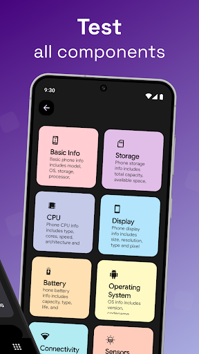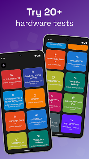 刚买了新手机,还是正在使用二手 Android 设备?想确定它完美无瑕,或是想实时掌握手机性能?立即下载“Android 测试工具”!这款专业级诊断工具专为你的 Android 设备设计,让你超级轻松地探索和测试手机的所有功能和传感器。<br>我们提供你所需的一切系统信息,全都在这款简单易用的应用程序中。<br><br>为何选择“测试你的 Android”?<br>- 新机验证必备!快速检查你新购买手机的每个细节,确保品质顶级。<br>- 快速故障排除!即时诊断手机问题,并了解你设备的状况。<br>- 全面性能监控!随时掌握 CPU、内存、存储速度和网络使用量等关键数据。<br>- 超级容易上手!我们简洁的设计意味着任何人都能轻松使用。<br><br>强大功能一览:<br>- 条码与 QR Code 扫描器:快速扫描,日常生活更便利。<br>- 水平仪:精准测量,校准不再是难事。<br>- 分贝计:检查环境噪音水平。<br>- 手电筒:为任何紧急情况做好准备。<br>- 已安装应用程序列表:轻松管理你的应用程序。<br><br>超过 35 种专业硬件测试与传感器诊断:<br>- 存储空间速度测试:快速检测手机存储性能。<br>- 屏幕刷新率测试:验证屏幕刷新率,享受极致流畅的画面。<br>- 实时系统监控:CPU、网络和内存使用量一目了然。<br>- LCD 屏幕色彩测试与坏点修复模式:检查屏幕健康状况并找出潜在坏点。<br>- 屏幕刷新率测试:验证你的屏幕实际刷新率,确保画面极致流畅。<br>- 存储空间速度测试:测试内部存储的读写速度,找出性能瓶颈。<br>- 声音与震动测试:确保音频和震动功能正常运作。<br>- 前后摄像头测试与信息:检查你的相机并获取详细规格。<br>- 触控屏幕与多点触控测试:确保触控灵敏且准确。<br>- 光线传感器测试:验证自动亮度调节功能。<br>- 指纹、麦克风与 GPS 测试:全面检查核心功能。<br>- 加速度计、NFC、距离传感器、重力传感器与压力传感器测试:确保所有传感器正常运作。<br>- 指南针测试:验证方向准确性。<br>- 电池、CPU 与内存信息:深入了解你设备的核心数据。<br>- SIM 卡与 Wi-Fi 信号信息:掌握你的连接状态。<br>- 蓝牙与震动测试:确认无线连接和提醒功能。<br>- 音量与 OpenGL-ES 信息:详细的音频和图形处理信息。<br>- Root 检查器:一键检测你的设备是否已被 Root,确保系统完整性。<br>- 安全性修补程序级别信息:轻松查看你的 Android 安全更新状态,保护手机安全。<br>- DRM 信息:显示设备的数字版权管理详情,确认你的高清串流播放资格。<br>立即下载“Android 测试工具”,确保你的设备发挥最佳性能!