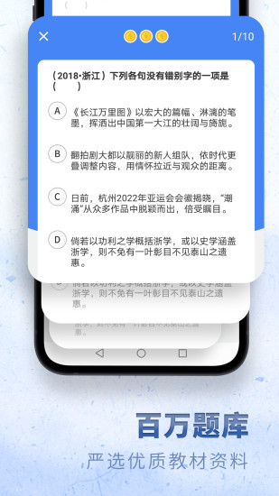 考神君用心陪伴整个高中时刻,助你学习一臂之力!! 精选高中语文语法、修辞手法、文言文、散文、议论文等常考内容,帮助你查漏补缺高效提分!练习后更有智能错题分析,让你的薄弱点一目了然,帮助你针对性学习语文,刷题效率翻倍,学习之路畅通无阻! 1.趣味闯关模式,等你来战! 精选研发游戏化的闯关模式,让复习变得更加有趣,同时还会帮助你检验课堂学习效率究竟如何哟~智能督促你的学习,让你的效率一高再高!冲刺高分 2.语文期末常考知识点总结 涵盖字音字形词语、语法、修辞手法、成语、文言文、标点符号、语病、句子衔接等期末常考内容,附带详细题型解析,帮助你稳扎稳打巩固基础,题目再变也能轻松应对! 3.分类学习模块,科学又高效! 将易错本,笔记本,自学视频,自学音频四大模块科学分类,让你的思绪更加清晰,刷题事半功倍! 4.真题知识点回播。 古代诗歌鉴赏、散文阅读、议论文精讲......随时随地想听就听,自由播放可反复复习,想听哪就听哪,自由自在!