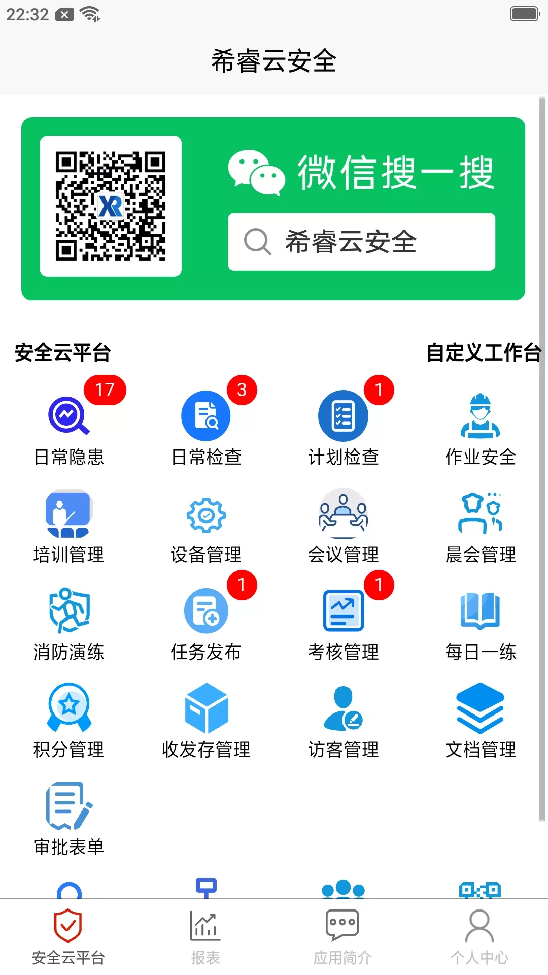 希睿云安全为企业用户提供一站式安全办公管理服务平台,助力企业安全生产标准化建设! 1、安全隐患、隐患排查、安全检查、计划排查、隐患整改 2、安全培训、培训提醒、培训签到、培训教材、培训照片、 培训题库、培训考核、培训评估 3、积分管理、奖惩单、积分报表 4、设备管理、特种设备、设备点检、设备保养、设备维修 5、安全会议、会议提醒、会议签到、会议资料、会议照片、 会议进度、会议评估 6、题库管理、考卷管理、每日一练 7、安全作业、作业许可、作业审批、安全作业管控措施 8、安全事故、事故登记、事故报表 9、安全目标、目标计划、安全进度、进度跟踪、进度提醒 10、文件管理、文件发布、文件签收、文件有效期 11、安全考核、考核评分 12、访客系统、访客登记、进出管控