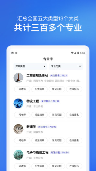 【介绍】 在职研究生招生信息网APP是以报考在职研究生为主题的官方网站,主要提供在职硕士(同等学力、非全日制研究生)、在职博士、国际硕士、MBA、EMBA等类别的在职研究生招生简章、报考条件、报名时间、报名入口等招生信息,为学员提供一站式、全方位的咨询服务,是报考在职研究生综合门户网站。 【院校库】 在职研究生院校库汇聚国内985/211院校及国外知名院校。国内在职读研院校有:北京大学、清华大学、中国人民大学、北京理工大学、复旦大学、同济大学、湖南大学及浙江大学等。国外知名免联考MBA/EMBA院校有:荷兰商学院、美国林肯大学、法国布雷斯特商学院、首尔科学综合大学院大学等。 【专业库】 在职研究生专业库提供全面的专业信息:哲学、金融学、经济学、法学、工商管理(MBA、EMBA)、教育学、心理学、公共管理、理学、计算机科学与技术、医学等。 【简章库】 在职研究生简章库提供在职研究生各大院校招生简章,包括报考条件、学费学制、开课地区、授课方式、报名时间等信息。 【读研方式】 在职研究生招生信息网为学员提供6种在职读研方式:同等学力申硕、非全日制研究生、在职博士、研修班、中外合办、国际硕士。 【海量研讯】 在职研究生招生信息网为学员及时更新各大院校招生简章、招生信息、考试资讯、考试大纲、报考条件等相关信息。在职研究生招生信息网APP为在职考研同学提供在职教育规划与指导! 【问答库】 问答库是百万在职研友交流聚集地,学长学姐在职考研经验分享。在职研究生问答库提供全面的报考信息、备考经验、调剂攻略、面试宝典等等!你的问题将会在这里找到答案! 【历年真题】 在职研究生真题库提供全面的历年真题,模拟考试,错题重做,强化训练,随机组卷,为您巩固重点,一对一辅导,考前冲刺卷,助您轻松过关。 【关于我们】 在职研究生招生信息网为考生提供优质、高效、个性化的一站式在职考研服务,是考生在职考研路上的好帮手!在这里,每一个有意愿提升自己的人都可以获得好的高等教育。 【公司文化】 集大成者,卓立宇内; 天行健,君子以自强不息;地势坤,君子以厚德载物; 坚韧与自强,是我们面对困难与险阻的信念,我们不会轻言放弃; 思考与创新,是我们对待工作与事业的态度,我们将会开阔进取; 执行与融合,是我们对待团队与企业的习惯,我们将会同舟共济。 【联系我们】 •在职研究生招生信息网电脑端:www.eduego.com •在职研究生招生信息网手机端:m.eduego.com •抖音账号:在职研究生招生信息网 •官方微信:在职研究生信息网 路灯考研 •官方微博:@在职研究生招生信息网-官网