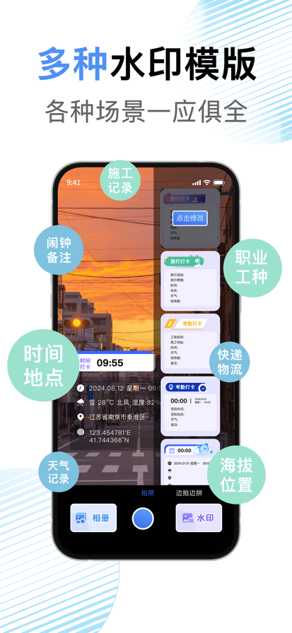 这是一款集拍照、水印编辑与创意拼图于一体的多功能工具,轻松覆盖工作、生活、学习全场景需求,让照片标记更高效、更个性。 核心功能亮点 - 拍照+水印一体化:拍摄瞬间即可添加水印,无需二次编辑,时间、天气、地点、海拔、经纬度等信息实时生成。 - 多场景水印模板:内置工作与通用两大核心类型,工作场景适配考勤打卡、工程记录、外勤取证、值班报备等需求,通用场景满足旅行打卡、生活点滴记录等日常使用。 - 高度自由自定义:水印内容可一键开关,支持自由添加文字、备注或专属标识,大小、位置、透明度等参数均可灵活调整,打造专属水印样式。 - 创意拼图工具:提供丰富拼图模板,支持网格、长图、自由拼接等多种布局,轻松将多张工作照合成专业汇报,或把生活瞬间拼成完整叙事。 实用价值优势 - 工作中,可快速生成带真实时间地点的凭证照片,拼图功能让工作报告制作更高效,提升办公专业性与沟通效率。 - 生活里,旅行轨迹、日常点滴能通过水印留存关键信息,拼图则让社交分享更具故事感,还能通过自定义水印保护作品版权。 - 操作简单易上手,无需复杂学习,各类模板与自定义选项兼顾便捷性与个性化,满足不同用户的差异化需求。 【VIP会员】 - 付款:用户确认购买并付款后记入 iTunes 账户。 - 取消续订:如需取消续订,请在当前订阅到期 24 小时以前,手动在iTunes/Apple ID 设置管理中关闭自动续订功能。 - 续订:苹果 iTunes 账户会在到期前 24 小时内扣款,扣款成功后订阅周期顺延相应期限。 隐私政策:https://www.termsfeed.com/live/bd6545bf-a981-4abd-81f7-ad87e9b644df 服务条款:https://www.termsfeed.com/live/173c83c5-6bb7-4cda-ac38-9c106676bd05