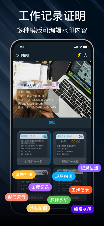 照片视频一键添加水印。海量水印模板,精准时间地点,各行业工作者的共同选择。 【专业水印模板】 考勤打卡、工程记录、旅行记录、执勤巡逻、品牌宣传、会议记录、物业管理、值班记录,适合多种行业水印,还可以自定义专属水印模板。 【多种水印类型】 时间、地点、天气、经纬度、湿度、人数、运动步数、天数、电话、特色等。 【时间地点精准】 支持拍照水印、视频水印,精准锁定当前位置,轻松打卡;自动同步更新日期、地点、天气等信息,支持记录经纬度、海拔和速度,真实还原多种工作和生活场景。 【自定义水印】 可自由开关和编辑水印,设置地点、添加备注、更新今日运动步数、旅行打卡心情记录等多个通用水印选项。 关于订阅: - 付款:订阅按周度或月度收费,费用视所选订阅计划而定。确认购买后,订阅款项将从您的 iTunes 账户中扣除。 - 续订:包含免费试用期的订阅将自动续订为付费订阅。除非在当前订阅周期结束前 24 小时关闭自动续订,否则订阅将会自动续期,而费用将会从您的 iTunes 账户中扣除。续订的费用取决于您的订阅计划。 - 取消续订:如需取消续订,请在当前订阅周期到期前 24 小时内,手动在 App Store 订阅管理中关闭续订功能。 使用应用即表示您同意我们的隐私政策和使用条款: 用户协议:https://docs.qq.com/doc/p/3434dedd4f9a7527580441a470a4bdde971af103 隐私政策:https://docs.qq.com/doc/p/20eef1f85c49f1efd7ebfdcca8d47730d9b19ca5