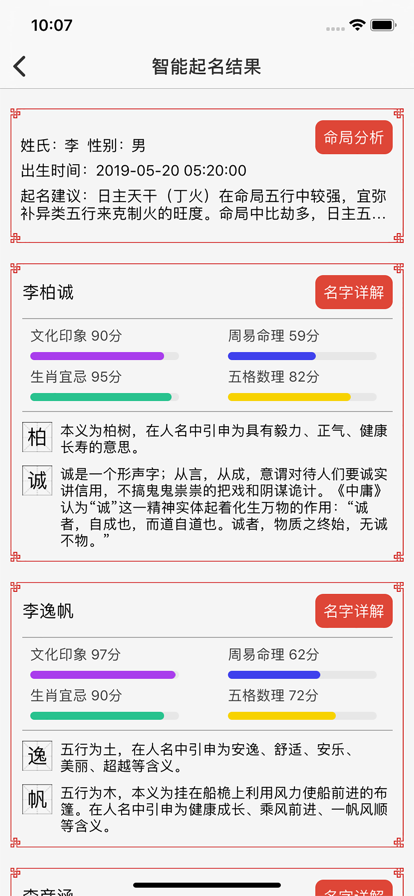起名大师智能起名系统,基于行业最新的五行量化分析体系建立,能够对命主生辰八字、五行旺衰、文化印象、生肖宜忌、五格数理进行全面分析并给出最适合的起名建议。 名字精选寓意好、新颖大气、朗朗上口的好名字,为您起名提供有价值的参考。 姓名不仅代表一个人的符号,还有更深刻的寓意,人一生有个靓丽的名字不仅别人印象深刻,而且关系到一生的事业和人际关系。因此,父母给子女取个好名字,才能使其一 “ 名 ” 惊人。 【起名大师】专业研究周易五行起名,全面解析姓名密码 【软件特点】 1.权威的智能分析起名系统,对算法反复严格检查,确保准确性。 2.对所有基础数据进行人工校对。 3.遵循传统周易五行理论,传承易经文化。 4.图形化数据展示,名字是否适合命主一目了然。 5.多维度姓名详解,四维综合评分,让您对名字了解更全面。 6.使用真太阳时进行八字排盘,分析结果更准确。