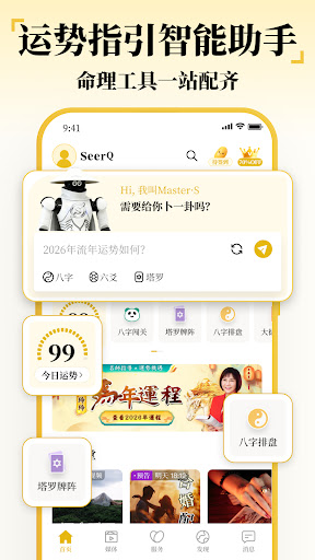“算命大师”是专门针对命理爱好者开发的应用,以古今四柱预测学命理典籍为理论和算法依据,生辰八字五行为基础,帮助命理爱好者了解自己命格和运势,为命理爱好者提供全面的运程预测,包括事业、财富、婚姻、感情、流年等。<br>主要功能特点:<br>【黄历日历】万年历,每日宜忌查询;<br>【个人运程】每日运势分析,让您快速了解每天的运势走势;<br>【个人分析】传统八字精批、流年运势预测,掌握个人运程走势;事业、财富、婚姻、感情、姓名、号码等分析,准确把握人生各阶段机遇,让您始终快人一步。<br>【星座塔罗】星座运程、塔罗占卜,知晓事务隐藏的信息,帮您理智判断;<br>【祈福许愿】点灯、请符、求签、许愿,在线祈福保平安;<br>【精彩福利】更有在线坐禅,敲木鱼等让您无障碍静心修行小工具等您体验;