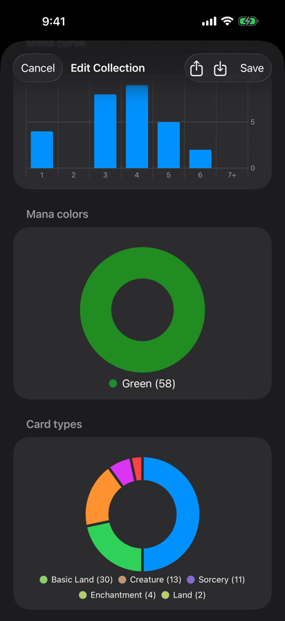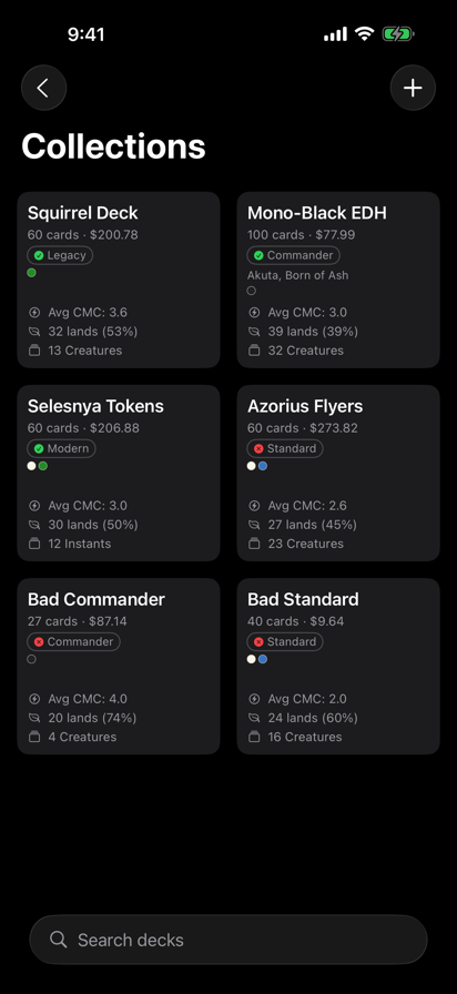 Magic trading card game database is the premier iOS application for everything Magic. With its advanced grid view you can browse cards quicker than any other application. Now updated for iOS 26 with the new Liquid Glass design, dark mode, and improved performance throughout. MTG allows for editing and saving multiple searches, saving you from having to re-enter them each time you launch the app. FREE FEATURES: - Advanced search & browse options. - Life counter with player customization, textured backgrounds, undo/redo history, and multiplayer support. - Searchable by name, description, expansion, rarity, colors, artist & others. - Sort by name, price, rarity, collector number, and more. - Browse keyword abilities with quick-jump section index. - Small app size & image caching for improved performance. - Offline mode by pre-caching images. - Large grid for multiple card viewing. - Details laid out in an easy access view with all printings available. - Full-screen image viewer with pinch zoom and swipe-to-dismiss. - Bulk import — paste a card list to quickly build a deck. - Deck collections with 2-column card grid, mana curve stats, average CMC, and land counts. - Accessibility support with VoiceOver labels and hints. - Light and dark mode support. PREMIUM FEATURES (Requires IAP): - Access to the latest five sets. - Price guide that is updated often with stale cache detection. - Automatic updating card database with version tracking. - Unlimited deck collections. - Monthly and yearly subscription options. All prices are courtesy of TCGplayer.com Terms of Use: https://termify.io/terms-and-conditions/1637763460 Privacy Policy: https://termify.io/privacy-policy/1637856824