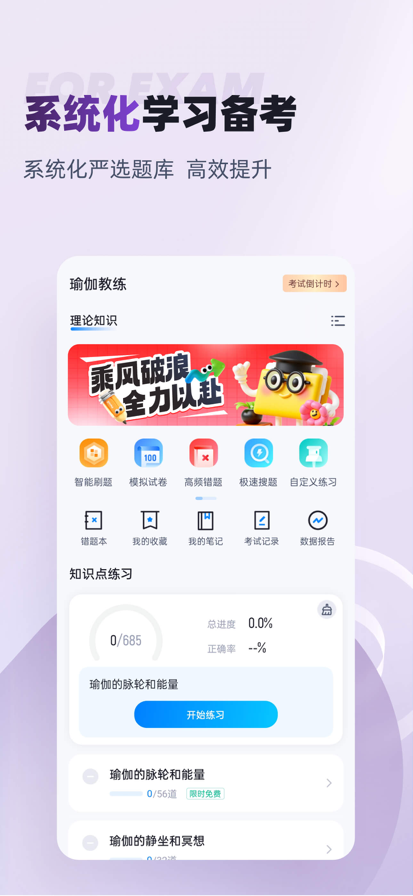 瑜伽教练题库APP是一款针对瑜伽考试的题库,涵盖了该考试热点、难点和常考点的考试模拟题库,是您学习和拿高分的好帮手! 瑜伽教练题库题库APP的主要特点: 1、强大的搜题功能 瑜伽教练题库APP新增搜题功能,瑜伽教练考试中的疑问一搜便知,更支持语音和拍照搜题。 2、丰富的练习与做题模式 瑜伽教练题库APP有模拟考场、历年真题练习、快速练习、考点练习、做题记录等多种学习与做题模式、丰富多样化的陪你一起考瑜伽教练证。