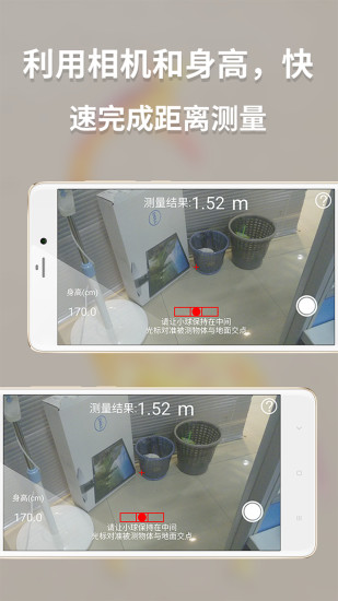 测距测量仪可以通过手机相机镜头测量物体的高度、角度和距离 无论是室内或室外的目标,相机测量仪都实用,你可以估算大楼的高度,树的高度,也可以估算家具的高度,人的身高等。 测距测量仪同时也是一款实用量角器,随时随地,测量任何你想测量的物体,实时显示度数。 主要功能: 【测量高度】 1:滑动调整相机镜头的高度; 2:将十字准星的中心对准待测物体的底部; 3:将十字准星的中心对准待测物体的顶部; 4:轻按“结束测量”按钮,测量结果将自动显示。 【测量角度】 1:将物体水平放置 2:将手机打开,使量角器水平线与物体水平线保持平行 3:测量结果自动显示 如果无法移动物体,可以让手机测量器的水平线与物体的一段保持平行 高大上的相机测量功能,镜头所到之处,一切皆可丈量,赶快下载吧! 备注:非专业测量工具, 测量结果不如标准工具做出的准确。