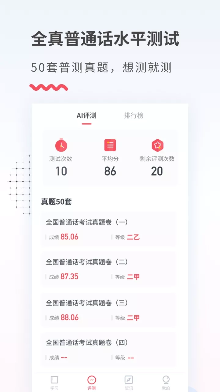 千万用户口碑推荐普测产品,普通话水平测试等级考试一站通关神器! 普通话学习APP,专业答疑解惑辅导普通话学习。 【3000万普友的选择】 手把手教你正确标准普通话读音,普测发音和普通话口语,让你轻松拿到普通话等级证书,说一口标准普通话!2025年普通话水平测试备考指导,为您指明普通话考试方向! 1.全面的普通话考试素材 内含《普通话水平测试》大纲表一表二,普测50篇短文朗读,普考50篇命题说话范文,附带范读音频,全面备考更方便! 2.丰富的普通话学习课程 普考声母、韵母、声调发音课程,还有普考视频教学课程,真人老师发音指导私教服务,选择适合自己的学习课程,学好普通话。 3.AI智能定制你的普通话学习计划 通过AI人工智能及大数据等技术帮您制定普通话学习时间与目标,自动为你定制普通话学习计划。 4.专业的发音评分功能 软件采用先进人工智能测评技术,对你的普通话发音进行评分,帮你找出错误发音。针对性纠正,有效提高普通话水平。 5.普通话学习互动社区 玩转普通话学习社区,与广大普通话学友们一起交流普通话学习考试经验,更有趣玩配音、美文朗读等多个普通话圈子话题等你来解锁。 普通话学习软件等你