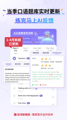 百词斩雅思,专注高效提分。提供水平测试、个性化备考规划、高效提分课、剑雅真题、口语AI实时陪练、高分语料库等多种功能。帮你少走弯路,高效屠鸭! 【150小时高效提分课】 精炼雅思历年高频考点+听说读写拿分技巧。让你只学重点,提分超快,比自学节省50%备考时间 【口语AI实时陪练】 针对口语开口难、提升难的问题,开发AI口语陪练功能。模拟真实考官提问,AI实时打分,纠正发音、词汇、语法问题,每次练习都有新进步 【个性化课表省心跟学】 根据水平测试,制定适合你的备考规划,哪里不会学哪里。学习任务安排到每天,不用找资料不用乱刷题,你只管学,所有安排交给百词斩雅思 【剑雅真题在线练习】 历年剑雅真题按试卷、题型分类,模考+解析,按需练习 【口语当季题库】 当季口语题库实时更新,新题保留题一目了然。影子跟读、高分范文、AI陪练…帮你快速熟悉高频考题 【口语听力语料库】 精选口语、听力高频考点词,互动课程+模拟练习+知识总结,2周让你听力听得懂口语有话说 【更多功能】 百词斩雅思持续更新中,还有词汇量测试、口语直播、单词训练营等多种功能等你探索~ 有任何疑问或建议,欢迎通过公众号「百词斩雅思」联系我们