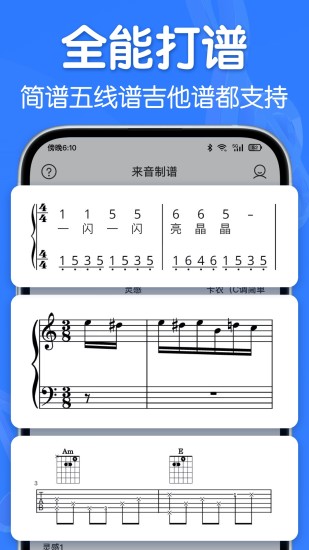 这是一款简单易用的乐谱制作软件,专为音乐爱好者和专业音乐家设计。简单高效的键盘输入法,通过敲击所需音符即可生成乐谱。你也可以通过AI拍照识别功能,快速生成智能乐谱,支持五线谱转简谱。 【编谱能力强】 可创建编辑钢琴、吉他、古筝、小提琴、尤克里里,声乐等乐谱,支持多part自定义乐谱编辑、五线谱/简谱/六线谱/弹唱谱/四线谱输入。 支持歌词、指法、小节、线、装饰音、奏法、力度、记号等元素输入,让你可以轻松创作出美妙的音乐作品。 【智能打谱】 如您有纸质乐谱,无需再亲自动手打谱,只需打开《来音制谱》 选择拍照上传,即可生成AI数字乐谱,更便于日常使用和携带。 【乐谱能播放】 支持乐谱的播放功能,编辑完乐谱之后,你可直接播放聆听你的作品,这将帮助你更好地预览和修改你的作品,极大的提升创作效率。 【操作简单高效】 自研科学高效的键盘输入法,各种音符、记号按键布局简洁明了,操作简单,上手快,让你创作乐谱更加得心应手,效率翻倍。 【可导出分享】 支持导出为PDF、MusicXML、来音乐谱、图片等格式文件,让你可以随时保存和分享你的作品到来音旗下app或是其他音乐软件。