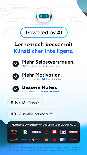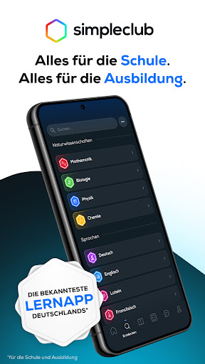🎓 德国最受欢迎的学校和培训学习应用程序!每月有超过 200 万人通过 simpleclub 学习。 <br>学习从未如此简单和有效!<br>也许您通过 YouTube 认识了我们 - 我们是德国最著名的学习视频的制作者。但您是否知道使用 simpleclub 应用程序可以实现更多目标?在这里,您可以体验完整的 simpleclub 体验,将您的学习提升到一个新的水平。<br><br><br>➡️ 为什么 SIMPLECLUB 是您完美的学习伴侣:<br>🔍理解而不是记忆:我们的互动课程引导您逐步理解。没有枯燥的非小说类文本,只是按照自己的节奏学习。<br>💡 始终知道自己的立场:我们向您展示您个人的理解水平,以便您始终可以确定自己是否真正掌握了某个主题。<br>🗓️ 无压力的成功:让我们来管理您的时间管理!如果您步调不一致,我们的个性化学习计划会自动调整。<br>🤖 只需按一下按钮即可获得帮助:只需在聊天中询问我们的人工智能导师 - 他了解所有材料,并将为您的每个问题提供单独的答案。<br>🗂️ 轻松记忆:创建您自己的抽认卡或使用我们的词汇扫描仪直接从教科书中扫描术语。<br>📅 Abitur 尽在掌握:为您的 Abitur 准备提供特殊学习计划,包括模拟真实考试。我们会告诉你你会得到什么成绩。<br>📈 经证实的成功:经我们的用户研究证实 - simpleclub 可以提高动力、自信心,并将您的成绩平均提高一个整级。 (KANTAR 收集,2023 年 11 月。使用 simpleclub unlimited/plus/trainee 对 500 名学生和 500 名实习生进行了调查)<br><br>➡️ 我们的用户评价:<br>“自从我开始使用 simpleclub 以来,我真的进步了!”<br>“我使用该应用程序已经两天了,我对这个主题的理解已经比我的老师还要多了。”<br>“我有 simpleclub unlimited,它确实帮了我很多。尤其是练习、抽认卡和学习计划,对于我这样一个杂乱无章、边做边学的人来说非常有用!”<br>“我真的很喜欢通过 simpleclub 学习。”<br><br>➡️ 获取应用程序并在学校放松身心! 😎<br><br>—<br><br>关于客户评论的法律声明:<br><br>https://support.simpleclub.com/hc/de/articles/7538929173137-Informationen-zur-Echtheit-von-客户评论<br><br><br>—<br><br>订阅和使用条款:<br><br>下载和使用 simpleclub 应用程序是免费的。在应用程序中,您可以选择成为“simpleclub unlimited”、“simpleclub unlimited plus”或“simpleclub trainee”会员资格。在这里您可以选择不同的术语。<br><br><br>确认购买后,您的 Google Play 帐户将被扣费。除非在当前周期结束前 24 小时取消,否则订阅将自动续订。付款将在当期最后24小时内从账户中扣除。<br><br><br>购买后可以在您的帐户设置中管理和取消订阅。一旦购买,当期不可取消/退款。如果提供测试阶段,它将在您完成订阅后结束。<br><br><br>使用条款:simpleclub.com/terms of use<br>数据保护声明:simpleclub.com/datenschutz