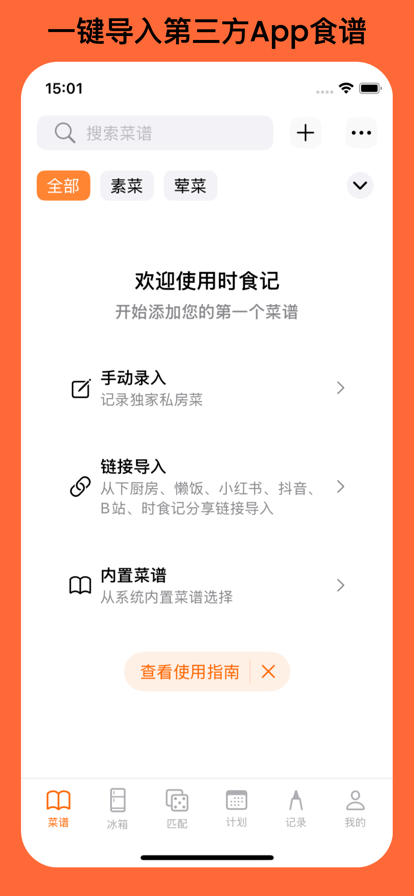 「时食记」是一款记录菜谱、冰箱库存的App 「时食记」的主要功能: - 菜谱记录:支持从下厨房、小红书图文笔记、小红书视频笔记菜谱分享平台导入(使用AI智能解析菜谱用料和步骤),您可以记录私房菜 - 冰箱管理:跟踪冰箱中有的食材、从菜谱库中匹配菜谱,也可提醒过期时间,帮助消灭库存,食材不浪费 - 饮食计划:J人必备,提前规划好一周或更长时间的菜谱,到饭点再也不用临时抱佛脚,要吃什么做到心中有数 - 家人共享:家人可以加入到家庭组中,共同规划吃什么,你做饭来我买菜,分工合作更有效率 - 烹饪模式:做饭的时候想看手机菜谱但腾不出手来怎么办,打开烹饪模式,眨眼睛就能翻页看菜谱 - 转盘抽菜:实在不知道吃什么,随机转一道吧!至少节省10亿个脑细胞 - 步骤计时:炖肉做汤时间久,打开步骤计时器就能做别的去了,到时间自动提醒 打工人工作忙,很多时候连好好做一顿饭吃都是奢望,再加之长时间的通勤,点外卖或路边小吃也就成了无奈的选择,然而这存在着种种健康隐患。 「时食记」致力于改变这一状况,通过简化决定吃什么、采购食材、烹饪的流程,使做饭变得灰常迅速,让您吃的省钱又健康。 你是否也有以下烦恼: - 纠结每天早餐/午餐/晚餐吃什么? - 要记着买什么菜嫌麻烦? - 做菜工序记不准时间? 「时食记」的解决方式: - 使用吃饭选择转盘随机抽取一道菜,也可以一键生成一周计划 - 未来计划需要的食材将自动加入菜蓝子,方便去超市对照买菜,再也不用记啦 - 可为菜谱每个步骤设置记时器,到时间将自动提醒 联系我们: 使用中遇到任何问题,或有意见和建议,请在作者小红书中提给我们,您的每条反馈对我们持续改进产品都至关重要。
