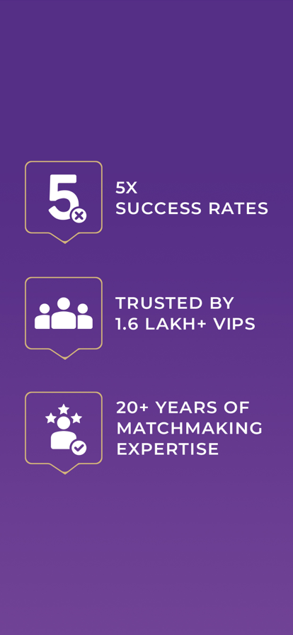 VIPShaadi.com is an exclusive, by-invitation-only matchmaking service for society’s finest. With over 20 years of expertise, we are the most trusted app in the matrimonial industry. We leverage our discreet global network to find you the right partner, befitting your stature. VIPShaadi.com (sometimes misspelt as VIPShadi.com), the world's largest matchmaking service, is more than just another matrimonial app. With a new match being made every 2.4 seconds, our elite matrimony service proudly boasts of more than lakhs of success stories! VIPShaadi.com combines this expertise and innovation to offer you a one-of-a-kind exclusive VIP matrimonial services. We understand that HNI's, affluent businessmen and professionals of the urbane society need a distinguished set of consultants to cater to their specific needs. The experienced consultants of VIPShaadi.com work with you to identify and interact with only like-minded people, thereby creating an accurate and successful match with 100% confidentiality. Our premium matrimony app has an intuitive interface, and our service allows our members to enjoy exclusive features like: - Top consultants with 25 years of elite matrimony experience - Your very own expert consultant will understand your needs and find you elite matches accordingly. - Premium Bio Data Creation - Your consultant will get to know your profile and create a designer biodata tailored just for you. - Curated Matches - With our VIP matrimonial service, you skip the hassle of looking at endless profiles because your top consultant recommends matches curated just for you based on your interests that match your requirements. - Background Verifications - Your safety is our priority. You can access background verification services with your membership, based on your selected plan* - Assured Meetings - Your consultant will go a step further to set up assured meetings with prospective matches so that your journey to meeting the one is as smooth as possible. - 100% Privacy - Our Elite matrimonial app ensures 100% privacy, ensuring that your big announcement is made only when you are truly ready. Our consultants and exclusive matrimonial services ensure that your VIP experience is second to none. Our 5x higher success rate is testimony to the fact that this elite matchmaking service is the top choice for you. We have an extremely niche and elite clientele, and we pride ourselves on making them meet their perfect match as per their preferences and requirements. Besides finding Matches in India, you can connect with NRIs from countries like USA, Canada, UK, Australia and Singapore. You can also find Matches right in your city; be it Mumbai, New Delhi, Bangalore, Hyderabad, Pune, Kolkata, Chennai, Ahmedabad, Indore, Dubai, London, New York, San Francisco, Toronto, Sydney or Melbourne. Download the VIPShaadi.com app today and begin your search for your life partner now!