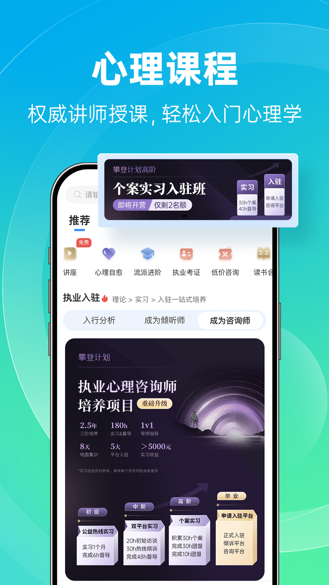 【新人首单免费】 心理咨询汇聚上万名资深心理专家、情感专家、亲子教育专家、婚姻家庭专家等全领域专业心理咨询师,为您提供心理健康、情绪压力、亲子关系、职场发展、人际交往、婚恋情感、抑郁症、焦虑症、强迫症等各类一站式心理咨询服务。 <br>我们的特色: <br>【专业权威,师资强大】由海内外优秀心理学家领携,严选心理咨询师、专业团队审核、专业督导师等全方位把关,确保咨询师专业服务水平。 <br>【发展迅速,国内标杆】服务保障7X24小时,截止目前,注册用户数4300+万人,付费咨询时长6亿+分钟;入驻专业心理咨询师近42000名,累计服务300万+用户和家庭,遍布全国各地,全国心理健康专业教研机构广泛合作。 <br>【公益服务,回馈社会】平台入驻咨询师除了在线提供解答服务外,长期致力于公益,回馈社会。 <br>【隐私安全,权益保障】文字、语音、视频安全加密,入驻咨询师人脸识别技术认证,平台提供权威法律保障协议,保证咨访双方权益。 <br>我们的服务: <br>【心理咨询】一键预约专家,一对一私人专属咨询心理健康、婚恋情感、情绪压力、人际关系、亲子教育、职场压力、个人成长等各类问题,线上线下多种选择,帮助用户解决生活困扰。 <br>【心理测试】2000+心理测试题,包含爱情、性格、心理健康、职场、情商等各类测试题型,帮助用户探索更多未知的自己。 <br>【心理倾诉】无需等待和预约,即时电话倾诉,不让烦恼过夜。 <br>【心理课程】无论是心理学爱好者,或是有心理困惑的朋友,海量泛心理课程供你挑选,李银河、李松蔚、胡慎之,知名大咖伴你学习。 <br>【专业督导】汇集行业资深从业者,组建专业的督导团队,定期督导培训并考察平台咨询师的专业素养和服务能力,保障平台咨询师的服务质量,争做“最专业的心理服务平台”。 <br>【壹点冥想】专业心理服务团队倾力打造,12个月精心打磨,数百节专业冥想课程,随时随地,帮助用户健康入眠、减压放松、提升专注,轻松应对工作生活烦恼。