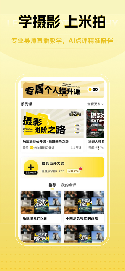 米拍深耕摄影领域,汇聚数百万国内知名摄影艺术家、爱好者,网红、职业摄影师、视觉内容消费者。 【学摄影】 直播公开课+KOL系列课+私域答疑,专业真人老师带你提高摄影水平、还有AI摄影助手指导你的每张图片。 【丰富活动】 精彩不断的征稿大赛,拍照赢取现金、流量、摄影器材等奖品。 每年推出大学生摄影夏令营、米拍摄影奖、手机影像100等IP项目,创造全新的摄影生活方式。 【全方位内容】 风光、人像、城市、纪实、胶片、美食、写真、汉服内容应有尽有。 来这里找到你感兴趣的照片、视频、文章、资讯、教程。 【摄影器材+好物众拍】 米拍器材栏目带来一手器材资讯,全网好物免费拍,新品设备0元体验。 【有米计划】 联合各大手机厂商锁屏,汇聚亿级曝光流量,助力优秀摄影作品变现。 【在各大平台找到「米拍」】 微信小程序丨微信公众号 | 小红书丨视频号丨新浪微博丨华为视界丨OPPO乐划锁屏丨小米画报丨vivo阅图丨荣耀锁屏丨三星锁屏 | 搜狗 | 联想丨今日头条丨百度丨企鹅号 | 抖音 | B站 【联系我们】 商务合作:xiaolajiao666 政企影像拍摄:yanggangphoto 社区合作:mipai-111