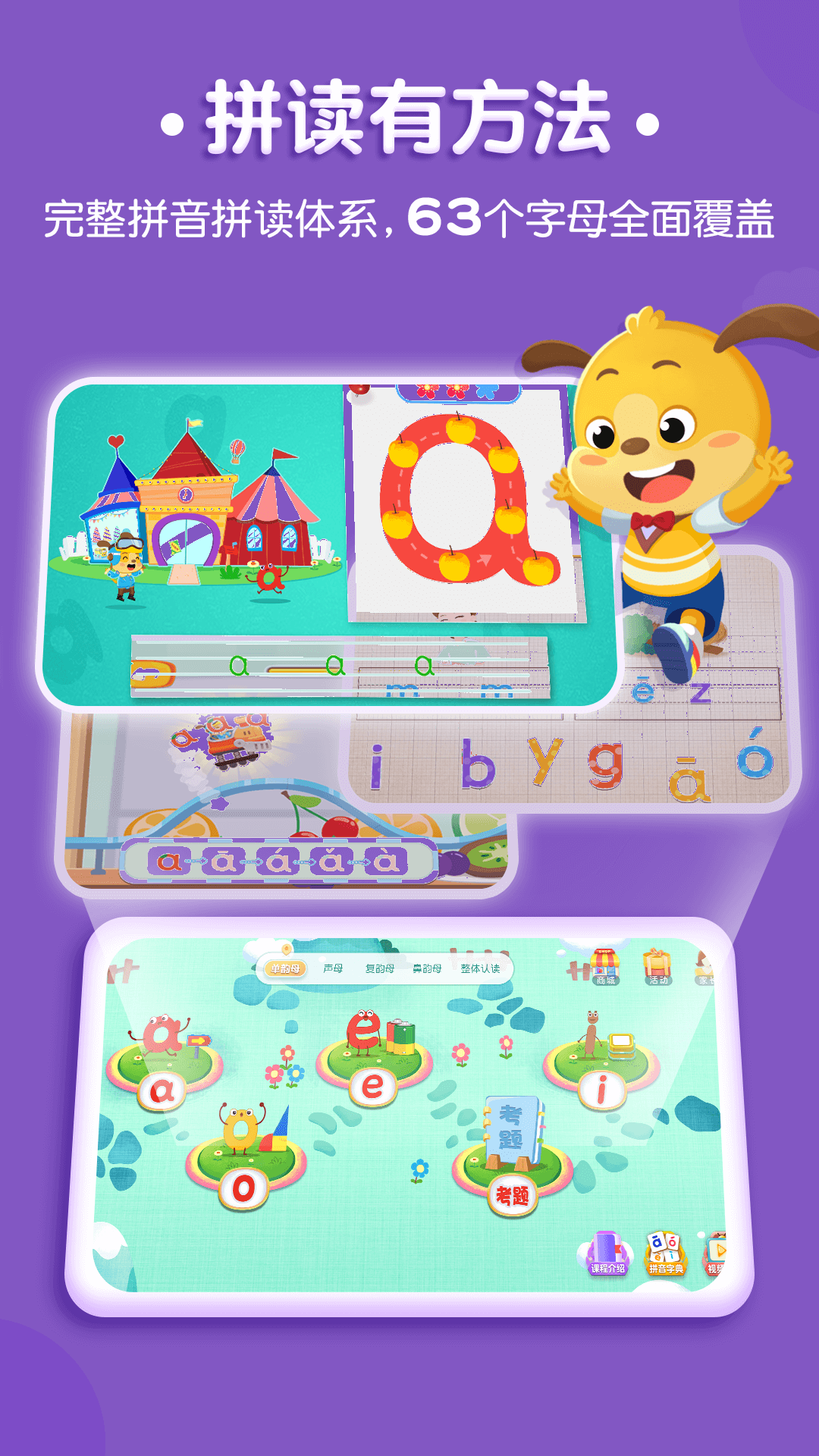趣味拼音启蒙,快乐学拼音! 一站式拼音启蒙课程,快乐学习,解放家长!声母、韵母、音节、书写、拼读全覆盖! 【课程内容】: 包括:23个声母;24个韵母(单韵母、复韵母、前后鼻音);16个整体认读音节;500多个汉字与词语的拼音拼读;63个字母的发音与笔顺练习;18个单元,81节课时,共126个游戏 【拼音课程特色】: 1、快乐学习:融合了笔顺、字母发音、汉字拼音,以可爱的卡通插图和高品质的动画,让小朋友在轻松的氛围下,学习的拼音发音与拼读。 2、内容丰富:掌握23个声母、24个韵母以及16个整体认读音节,500个汉字的拼音。 3、寓教于乐:126个游戏形式,学习与游戏相结合,轻松打好拼音基础。 4、用贴切的生活用语作为谐音,与字母的准确读音相结合,易懂又易记。 5、提供500多个汉字与词语的拼读练习,培养孩子的语感与模仿能力,为学习拼读打好基础。 【关注支持】 微信公众号:麦田家长通 麦田官网:www.mytian.com.cn 反馈邮箱:service@mytian.com.cn 客服热线:400-852-1661 欢迎联系我们,提出宝贵建议,共同为孩子提供更优质的教育服务