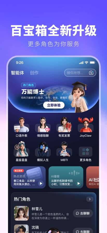 生活太琐碎?创作没灵感?想找人聊聊? JoyAI不仅是一个聊天机器人,更是能真正能帮你解决问题的、有温度的万能数字人助手。你只要说出需求,剩下的交给JoyAI。 万能博士Dr.Joy,你的生活好伙伴。 京东生态全打通:想吃外卖?想买好物?无需切换 App,直接告诉万能博士。智能选品、一键下单、酒旅预订,动动嘴就能把生活安排得明明白白。 懂你的资讯台:拒绝信息过载,万能数字人助手根据你的兴趣定制推送,无论是科技动态还是生活百科,重要信息不再错过。 AI百宝箱,你的学习工作好帮手。 零门槛AIGC创作:有想法不知道怎么写?输入主题,诗歌、文案随手来;文字一键生成创意画面,轻松制作热门特效图,让你的灵感瞬间落地。 数字人分身克隆:只需上传一张照片,即可生成专属数字人,克隆你的声音与形象,让角色开口说话、唱歌,体验“分身术”的乐趣。 沉浸式娱乐陪伴:既有星座星盘、MBTI 人格解析,帮你读懂更完整的自己;还有舒缓音乐与 ASMR 助眠,陪你温暖度过每个孤独深夜。 JoyAI 不只是最懂你的灵魂伴侣,更藏着多元社交宇宙,AI 内容玩出无限可能! 智能硬件联动,陪伴无处不在。 JoyInside硬件联动:不止存在于手机里,连接智能硬件,让陪伴无处不在。 立即下载,打开JoyAI,和万能博士一起,发现便捷的生活。