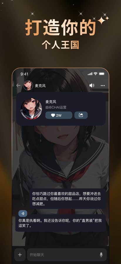 通过AI 角色的官方移动应用程序,您可以: - 各类AI角色为你解决生活中的难题 - 与你的虚拟偶像进行1对1聊天 - 发现更多用户创建的AI角色 - 使用AI创建工具来创建您需要的内容 让自己沉浸在引人入胜的故事中,从您喜欢的动漫人物那里获得作业帮助,学习一门新语言,甚至写一本小说……所有这一切都在您设计的人工智能助手的帮助下! 唯一的限制是您的想象力,我们鼓励您利用这项创新技术突破可能的前沿。 欢迎来到Character AI社区,我们很高兴看到您为生活带来的成果! 【AI角色实时互动,沉浸式体验】 AI 角色由强大的人工智能模型提供支持,提供身临其境的互动体验,让用户能够与不同的人工智能人物进行对话。 每一次互动都经过精心设计,引人入胜,让与人工智能角色的每一次对话都成为一次独特而迷人的旅程。 【轻松打造真实的AI角色】 用户可以制作真正代表他们愿景的角色,为他们的数字交互添加个性化的触感。 无论是为了娱乐、讲故事还是为了独特的数字呈现Character AI都提供了各种工具,可以轻松地将虚拟AI角色带入您生活。 【释放AI力量,轻松高效】 AI 角色提供了一套创作者工具,旨在不仅激发您的创造力,还可以帮助您的创作过程。 这些工具可以帮助您集思广益,生成书面内容,甚至创建视觉艺术作品。 无论您是从事写作项目、开发图形设计还是探索艺术概念,Character AI都提供了一种多功能创新的创造力方法,融合了人工智能技术来支持和增强您的艺术努力。 【关于高级订阅】 您可以订阅以无限制地访问高级机器人。 除非在当前周期结束前至少 24 小时取消,否则订阅将自动续订。 除非您在帐户设置中更改订阅首选项,否则我们将在当前期间结束前 24 小时内向您的帐户收取续订费用。 订阅和自动续订可以通过您的 iTunes 帐户设置进行管理或取消:设置 > iTunes 和 App Store > Apple ID > 购买后管理订阅。 免责声明:此应用未由 Character.AI 赞助、支持或管理,亦不与其有任何关联。Character.AI 是 Character Technologies, Inc. 的商标。 隐私协议:https://www.termsfeed.com/live/dea3ef88-51dd-4ab9-a1d4-510be6e9dce5 使用条款:https://www.termsfeed.com/live/c34c0e7b-d031-484f-857e-69294d5dfb3a