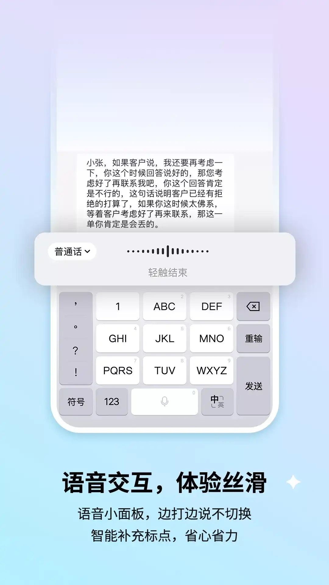 【主要功能】 【YAN键盘】颜/言/研新皮肤上线,多图轮播、文案百变,每次输入都有小惊喜; 【自定义皮肤】超多素材,支持多图DIY、百变文案DIY; 【智能预测】根据场景猜你想说,智能补全整句; 【AI智能输入】自适应输入场景,出词更智能; 【AI语音输入】支持中英混合免切换、方言免切换,更快更精确; 【离线语音】断网弱网语音输入一样准; 【AR表情】通过人脸识别技术制作多种逗趣表情; 【超大系统词库】50万系统词库,输入流畅,选词准确; 【人工智能引擎】智能整句输入算法加纠错算法,提高准确率; 【快捷搜索】边聊边搜,一步直达; 【游戏键盘】游戏短语、悬浮语音、和谐转换三大神器,助力上分、超神必备; 【懒人短语】内置多个短语分类,并支持添加个人常用语; 【自动同步】用户网络词、设置项、个性短语云端备份自动同步; 【超强中英混输】中文、英文、数字、符号自由混输; 【智能手写】支持叠写;边写边出字,识别速度快;毛笔字效果; 【超多输入方式】支持拼音、英文、笔画、五笔、语音等多种输入方式; 【语音速记】声纹区分角色技术首次在输入法登陆;