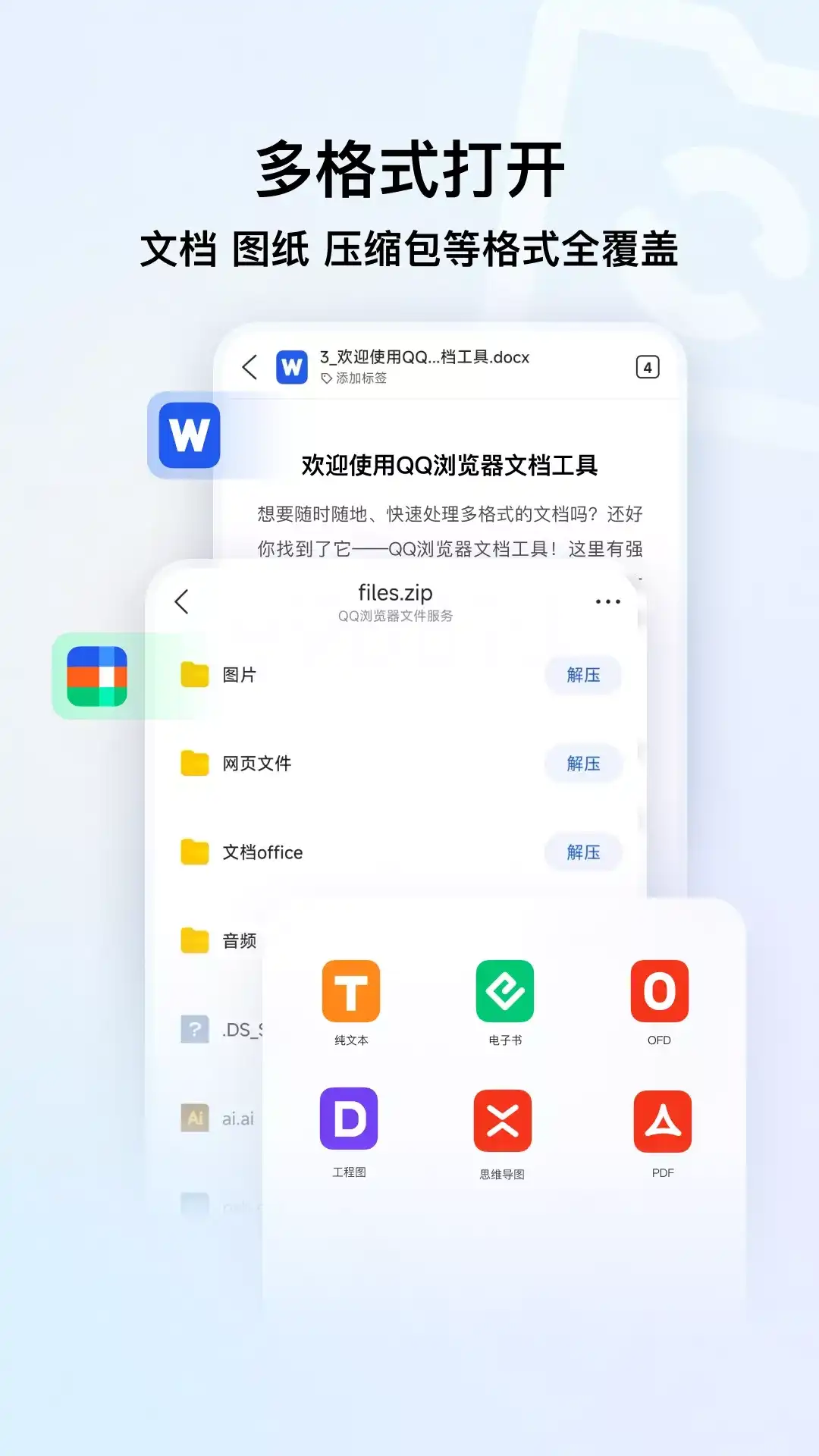 QQ浏览器,您的全能文件管家!支持PDF、Office、WPS等常规文档,更独家兼容设计图纸、3D模型等90%+特殊格式。 【AI公考通】 AI帮你智能筛选优势岗位,同时结合自身情况个性化定制,还能实时推送有编制机会,助你精准报考,高校上岸。 【AI学习助手】 拍照答疑秒回应,考点智能拆解,错题自动归集,更有相似题助你举一反三,薄弱点越练越少!定制学习路径告别拖延——AI学习助手,你的全能学习搭子 【AI搜索】精准直达 轻松秒懂 ●更快:最优解即搜即得,直接给你想要 ●更稳:长问题用深度思考,回答全面可靠 ●更懂:拍照搜、语音搜,AI看懂听懂帮你秒懂 【热点资讯】优质内容 及时丰富 ●更清晰:智能推荐你关心的时事、财经、科技、娱乐资讯 ●更全面:实时看全网热搜榜单,重大事件追踪报道+多角度梳理 【效率办公】办公工具 轻松提效 ● 更全面:支持90%+文件格式打开,完美支持打开PDF、Office、WPS等常见格式,更支持包括设计图纸、3D模型、思维导图、M3U8、压缩包,安装包等特殊格式,满足专业需求 ● 更省事:PDF与Office文档全能处理,支持格式转换、文档翻译