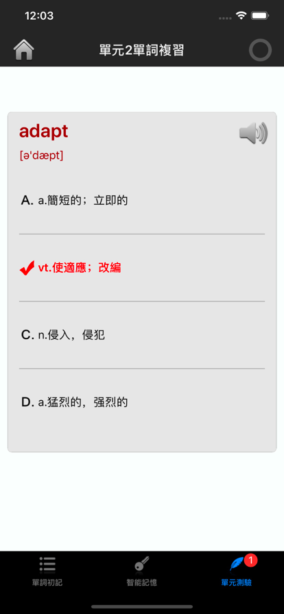 最新加入单元测试模块,助您检验学习成果。本软件提供新概念英语课本所有课程的单词列表,所有单词配有详细解释及发音。 完善的全能单词词库:包含简明解释、单词联想记忆、词性变化、同义词辨析、英英解释、丰富的用法例句等等,帮你快速理解背诵记忆单词!