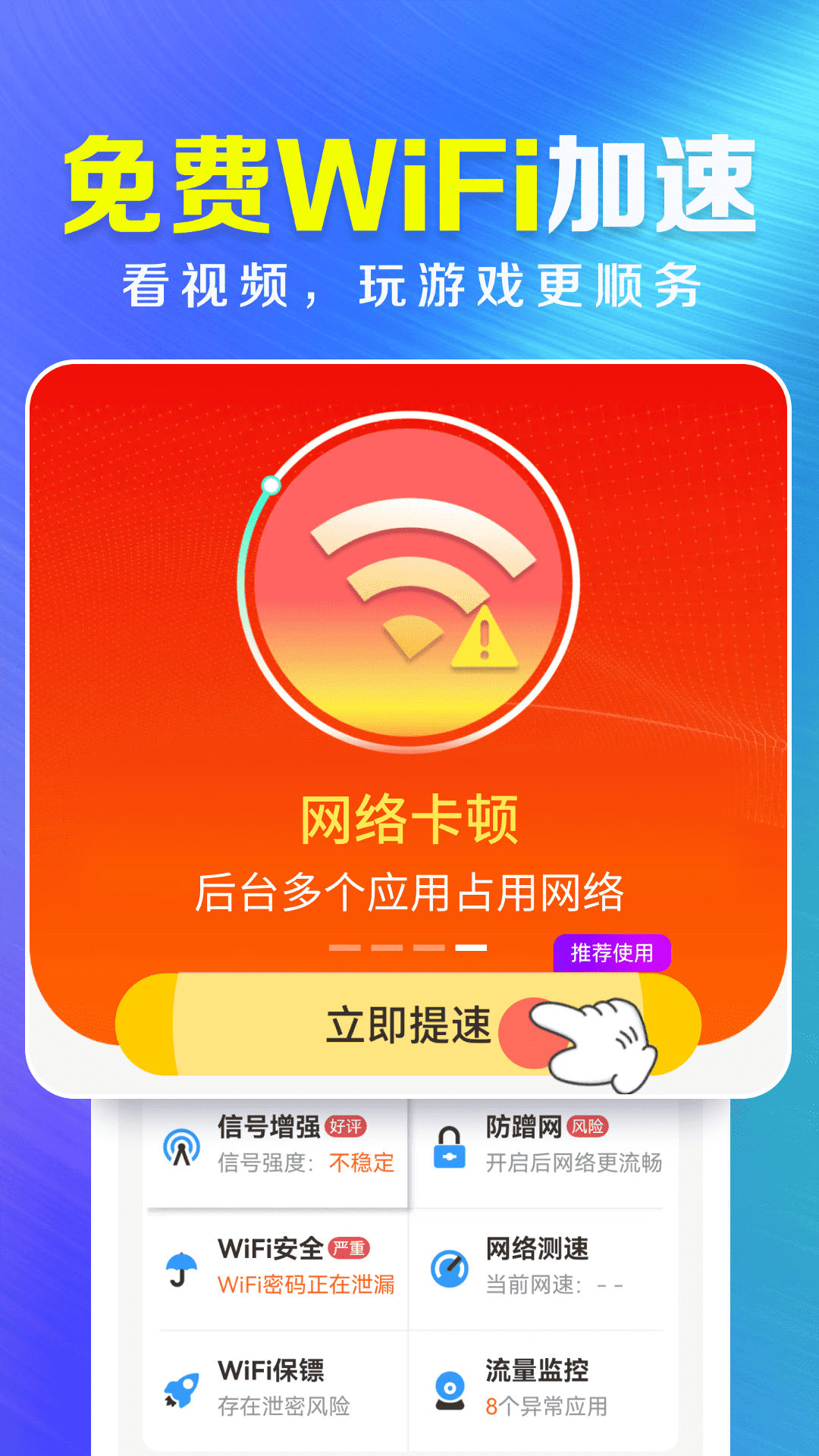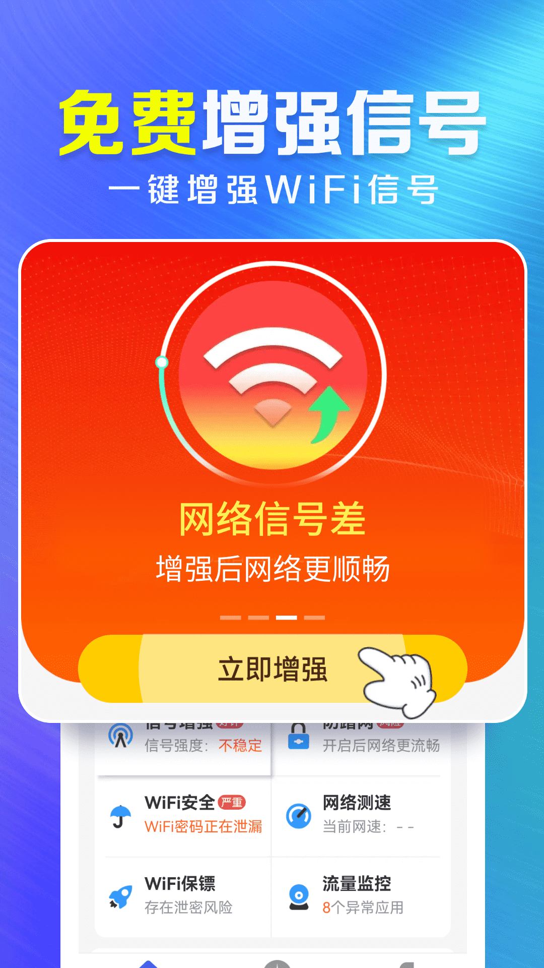 解决您的网络问题!<br>立即增强网络信号,让您畅享飞速上网体验。精准测速功能,让您随时掌握网络状态。蹭网防护功能,有效保护您的网络安全。<br>应用还提供安全检测、流量监控、支付安全等多重保障,让您的网络使用更加安全便捷。免费WiFi一键直连无忧!精准搜索周边免费热点,自动连接,让网络自由随行。无需密码,即刻畅游互联网,节省流量,尽享高速体验,生活工作更便捷。