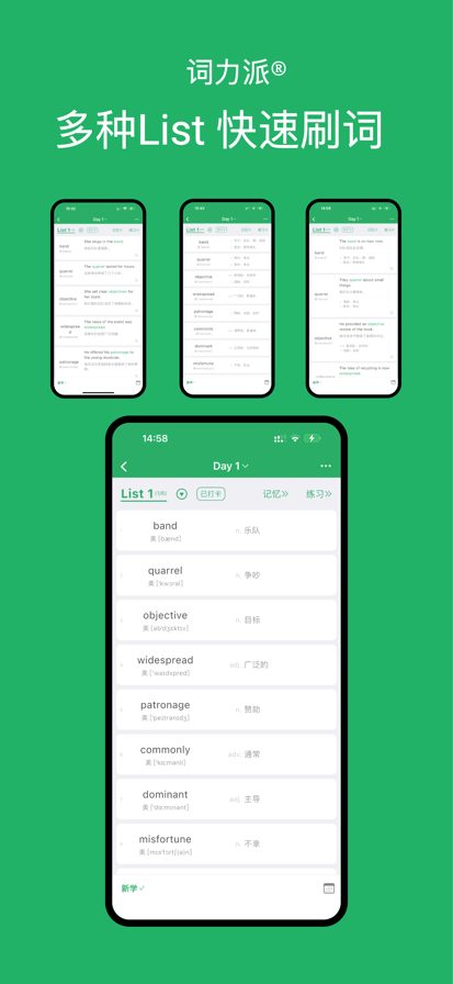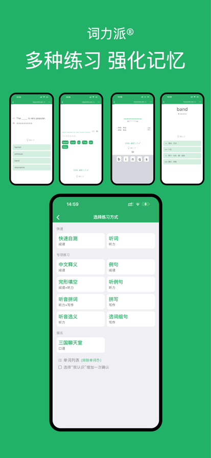 词力派®,一天背1000单词! 基于“艾宾浩斯记忆曲线” 和最新的学习理论自研了高阶学习曲线算法,背单词就是快! 功能特性: * 「内置词典 离线使用」:内置包含中英释义、易混辨析等百万级的内置词典数据,可以方便的在没有网络的场景离线学习单词。 * 「内置词库」:包含四六级、考研、出国、大学、高中、初中、小学等各个阶段的词书,还有新概念英语、BEC、COCA、剑桥、朗文、牛津等几百种其他词书。 * 「手写板」:学习单词时可以随时打开手写板,使用手指练习单词拼写,好记性不如动动手指头。 * 「选词组句」:最高效的最牢固的记忆单词的方法,选择词汇把打乱的句子重新还原,在使用中记忆单词。 * 「故事模式」:每个单词都准备多个有趣故事,记忆单词更加有趣和轻松。 * 「常用释义/完整释义」:现在词典支持常用释义/完整释义切换,方便同学们粗记或者快速刷词时,跳过不常用的释义,提升效率。 * 「多学习计划」:自由切换多个学习计划,计划间相互不影响,可以在主计划外,扩展学习范围,助你在学习中领先一步。 * 「学习计划表」:根据艾宾浩斯记忆规律曲线和最新记忆学习理论,间隔重复记忆,牢固你的记忆。 * 「PDF导出」:支持学习计划的PDF文件导出,配合纸质list练习,手脑同练,让你会读也会写,真正掌握单词。 * 「自定义词库」:支持从外部文件、现有词书或者手输导入自定义词库。 * 「生词本」:汇总学习和生活中遇到的生词,集中学习或者强化记忆。 * 「错词本」:汇总练习中的错词,方便日后集中学习或者强化记忆。 * 「星标词汇」:汇总学习遇到的难词,可以手动标记,方便日后集中学习或者强化记忆。 * 「熟词本+跳过今日学习」:对于未遗忘的词汇,可以快速当日学习或者加入熟词本,专注于不熟练的词汇,提升学习效率。 * 「词力测试」:测试词力,快速排查不同级别考试中可能的不认识的词汇,并且支持一键将认识的单词导入熟词本。 * 「双语/单语」:快速切换双语/单语模式,快速自测自查。 * 「英式/美式」:支持英式/美式发音+音标。 * 「记忆模式」:简洁高效,方便记忆单词核心内容和快速检测是否遗忘。 * 「中文释义练习」:从四个选项中,选择正确的中文释义,练习对单词中文的理解。 * 「拼写练习」:根据中文释义,从五个字母卡片中选择拼成完整的单词,也支持键盘输入,练习对英文的记忆。 * 「听写练习」:根据英文或者中文释义,拼成完整的单词,练习听力和拼写。 * 「听词练习」:根据读音,选择中文释义,练习听力。 * 「例句练习」:根据例句,回忆中文释义,练习阅读,加深记忆。 * 「完形填空练习」:根据读音和例句,补充缺失部分,可以同时练习听力和阅读。 * 「快速测试」:快速检测是否单词是否遗忘,节约复习时间,不留死角。 * 「随身听」:可重复间隔循环自动播放,支持自动循环英汉双语音频播放,即使工作运动时也可以学习。 * 「皮肤」:绿色、红色、紫色、蓝色、橘黄、青橙、粉色、咖啡色,多款主题色,可根据喜好自由切换。 * 「奖杯」:完成不同事件、月度或者连续天数挑战,都可以获得奖杯。 * 「时光勋章」:完成主计划全部任务打卡,可以点亮当日时光勋章。 * 「专注时钟」:学习时完成专注,可以获得绿色能量帮助专注森林成长。 * 「我的奖状」:多种奖状模版,方便与朋友分享成长快乐。 词力派®的设计理念: 1. 简单,专注。 简单就是美;专注就是力量。我们的设计哲学是排除一切干扰,专注于学习。 2. 三人行,必有我师。 见善则迁,有过则改。博采众家之长,择其善者而从之,其不善者而改之。我向前辈们学习,也向前辈们致敬。 3. 星辰大海,愿每个人都成为夜空中最亮的星星。 词力派®是我的第一款产品,我的目标是制作一个让每个人都能快乐学习英语的app。前路是星辰大海,我希望有机会为同学们做出更多更棒更有用的App! 结语: “学然后知不足,教然后知困”。词力派®一定还有很多不足之处,词力派在帮助同学们学习的同时,我也在奋力学习,所以欢迎同学们的吐槽和鼓励,你们的反馈都会变成鞭策和支持我前进的动力! 感谢看到这里的你 ~ 祝学习顺利,逢考必过 ~ 联系我: 欢迎同学们通过以下方式与我联系,大家的支持与建议会给『词力派®』带来无限可能! * App 内 - 首页 - 问题反馈 * 邮箱 support@adroki.com * QQ 群 1041393686