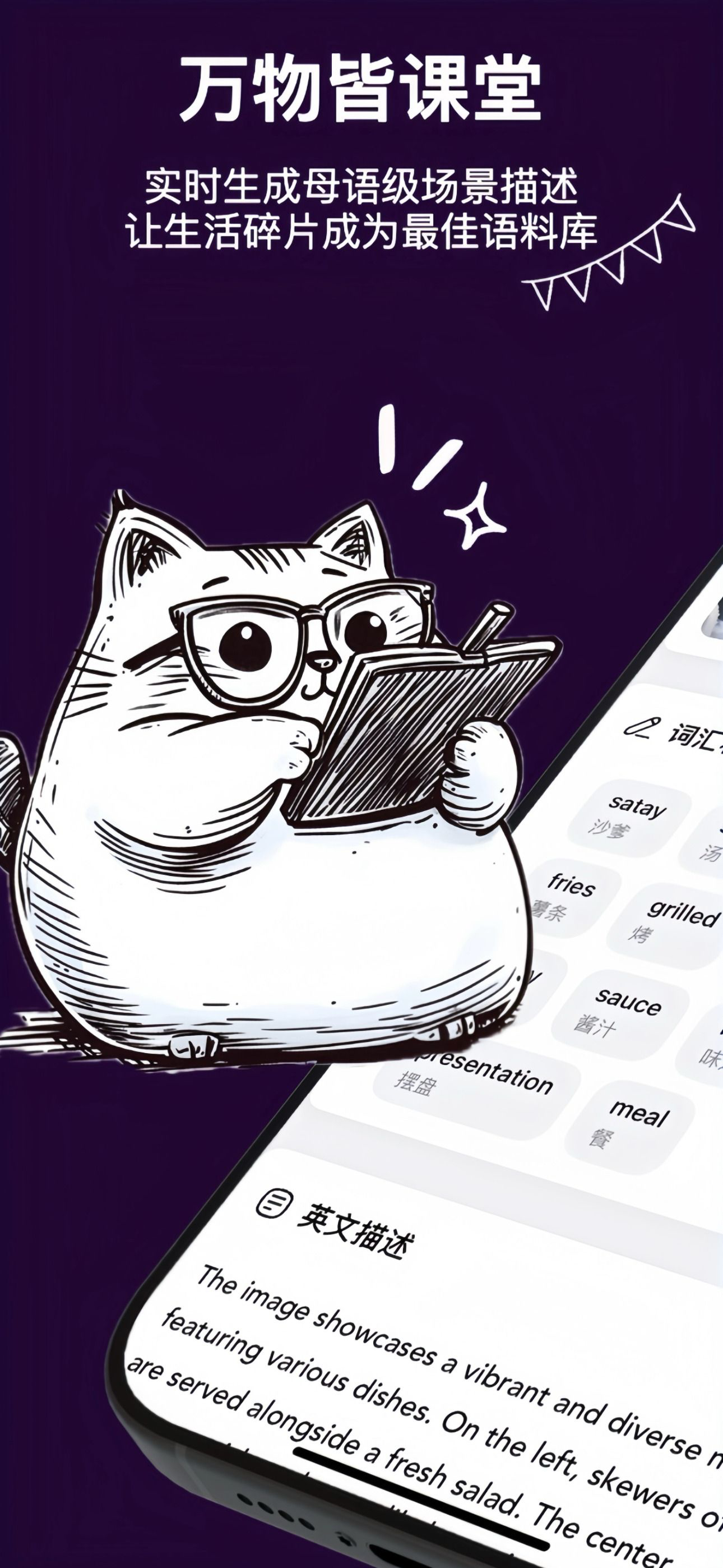 随手拍摄你的生活场景,AI实时解析生成: 【词汇短语包】提炼场景核心20+高频词,帮你在语境中遣词造句 【母语级范文】100%地道场景描述,告别中式英语 【智能中英对照】深度学习译文,生词一键查询 除此之外还有“生词管理”,“记忆图谱”等功能邀你体验,别忘了每日登录有惊喜奖励哦! 每个人的生活都有无限精彩,或许可以换个视角,认真学习和欣赏你的生活。而“语镜”可以让这个过程变得更简单、有趣、高效!立即下载,开启你的英语学习新旅程吧!
