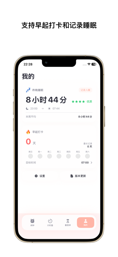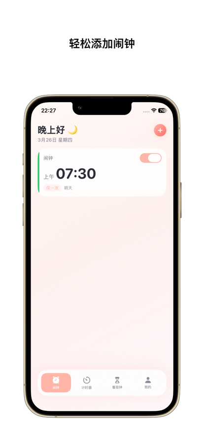 打工人闹钟是一款面向日常通勤与学习的智能闹钟应用,围绕**中国法定工作日与调休规则**做了专门优化:在工作日准时提醒你起床,在休息日减少误响,在国家公布的**调休上班日**仍会正常提醒。 **闹钟**:支持仅一次、每天、工作日、周末、自定义星期,以及**法定工作日**模式。法定工作日模式下,应用参考内置节假日数据自动跳过法定节假日,并在调休上班日正常响铃。你可以为每个闹钟设置名称、时间、颜色与铃声,并开启稍后提醒;仅一次闹钟还可选择在响铃后自动删除,保持列表整洁。 **计时器与番茄钟**:提供倒计时计时器与专注/番茄钟流程,适合做饭、运动、学习与办公。专注支持自定义时长,以及结束提醒、剩余时间提醒等选项(需系统通知权限),后台结束时可通过本地通知提示你。 **我的**:汇总**昨晚睡眠**(时长、入睡/起床时间、主观质量与本周平均),并可手动记录睡眠;提供**早起打卡**连续天数、本周打卡圆点与可自定义的起床目标时间,帮助你养成节律。 **设置**(从「我的」进入):包含**更多应用**精选推荐、**存储空间**查看与缓存/临时文件清理、**喜欢我们就给个好评**与**分享应用**、**隐私政策**链接,以及**样式**中的显示模式(浅色/深色/跟随系统)、主题色与**中/英/跟随系统**语言。界面为暖色柔光风格,数据本地保存。 **小组件**:可在桌面添加小组件,快速查看**下次响铃时间**或**闹钟列表**(需在系统设置中授权对应能力)。 **其他说明**:本应用**不包含订阅或一次性应用内购买**,所有上述能力均可直接体验。首次使用会引导你了解通知等权限,也可稍后在系统设置中开启。节假日数据随应用版本更新维护(当前内置近年区间,具体以版本为准)。
