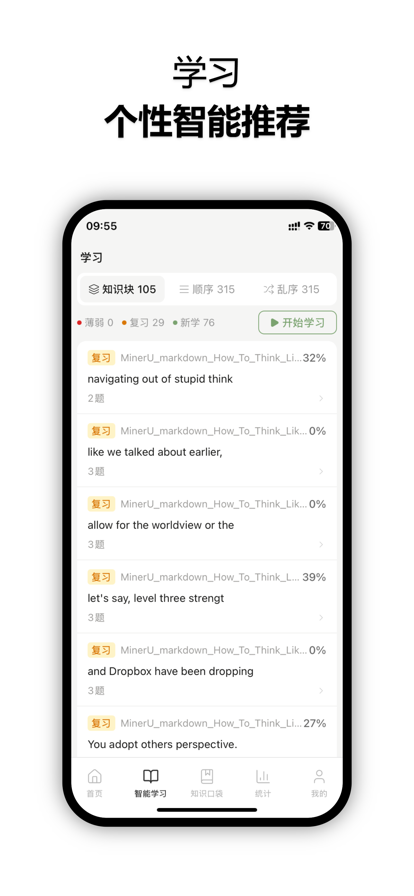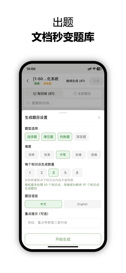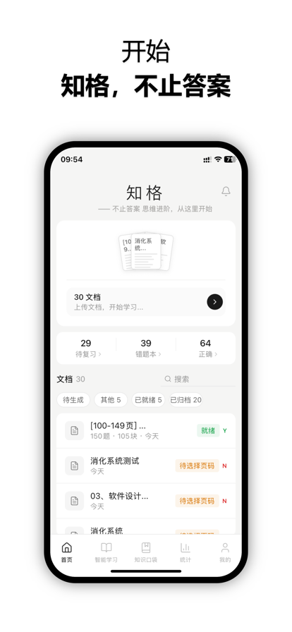 知格是一款基于 AI 的智能学习工具,帮助你将学习资料快速转化为可练习的题目,让学习更高效。 上传你的课件、笔记、教材等文档,AI 会自动分析内容并生成多种题型的练习题,包括选择题、填空题、判断题和简答题。通过反复练习和智能错题本,精准定位薄弱知识点,真正做到查漏补缺。 主要功能: - 文档智能解析:支持 PDF、Word、Markdown 等多种格式 - AI 自动出题:基于文档内容智能生成高质量练习题 - 多种题型:选择题、填空题、判断题、简答题全覆盖 - 智能错题本:自动收集错题,精准定位薄弱环节 - 学习数据统计:可视化学习进度和掌握情况 - 笔记收藏:练习中随时记录和收藏重点内容 适用人群: - 备考学生:期末复习、考研、考证 - 职场人士:技能学习、资格考试 - 终身学习者:任何需要系统化学习的场景 服务条款:https://zhigelab.com/terms 隐私政策:https://zhigelab.com/privacy