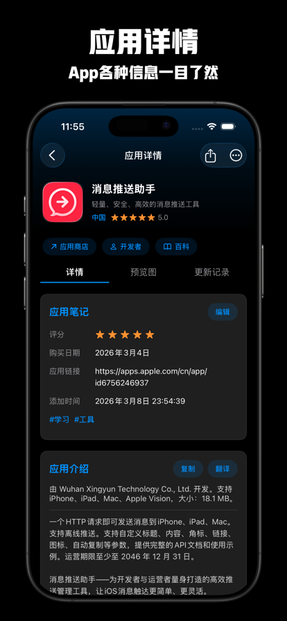 每个人的手机里都装着几十甚至上百个应用,有日常离不开的效率工具,有偶尔才打开的小众神器,也有付费订阅后渐渐遗忘的那些。「应用集」就是为此而生——帮你把所有应用整理得清清楚楚,随时回顾、轻松分享。 「灵活分类」打造专属应用收藏库 ,创建多个应用集,按工作、生活、摄影、学习,旅游,商务等场景自由归类。每个应用集都能自定义名称、图标和主题色,支持自定义图标和 Emoji 表情,让应用分类一眼可辨。拖拽即可调整应用集顺序,长按可快捷编辑、分享或导出。 「标签系统」跨应用集高效管理,为应用添加专属标签,比如「年度推荐」「健康」「精选」等。标签支持批量添加、重命名和拖拽排序,点击任意标签即可查看所有关联应用,跨应用集快速筛选,告别翻找的烦恼。 「多种添加方式」总有一种适合你,链接识别:粘贴 App Store 链接,自动获取应用名称、图标、开发者等完整信息,长链接、短链接均可识别。批量添加:一次粘贴多条链接,批量识别并添加到多个应用集。关键词搜索:输入应用名称关键词,直接搜索 App Store 并添加。App ID 搜索:通过应用的唯一 ID 精准定位。扫码添加:扫描 App Store 应用二维码,即扫即加。图片识别:从截图或图片中智能识别应用信息。系统分享:在 App Store 或浏览器中点击分享按钮,直接添加到应用集,无需切换应用。剪贴板读取:检测到剪贴板中的应用链接时,一键快捷添加。 「应用笔记」记录每个应用的使用心得,每款应用都能添加个人评分(1-5 星)、笔记、订阅价格、购买日期、购买时长和订阅描述。无论是记录「这款修图 App 的滤镜特别适合风景照」,还是标注「年费 ¥128,每年 3 月续费」,所有信息都留存在应用详情中,方便日后查阅和对比。 「应用详情」深入了解每款应用,查看应用的完整介绍、版本更新记录、截图预览、内购项目、开发者信息等。应用介绍和更新记录支持一键翻译,方便了解海外应用。点击开发者名称可查看该开发者的全部应用,发现更多好用的工具并一键添加。支持多地区切换,查看不同国家和地区的应用信息与价格。 「搜索定位」秒级找到目标,全局搜索覆盖所有应用集中的全部应用,支持应用名称模糊匹配。进入某个应用集后,还能使用集内搜索精准定位,在上千个应用中也能快速找到目标。 「应用监控」掌握实时动态,关注应用的价格变动、版本更新和上下架状态。当关注的应用降价、发布新版本或下架时,第一时间获知,不再错过心仪应用的重要更新。 「精美分享」推荐好应用给朋友,一键生成 3 种样式的应用分享卡片,支持自定义背景颜色、文字主题和标题模式,打造精致的推荐卡片。整个应用集也能导出为文件,好友通过系统分享一键导入即可同步所有应用和笔记,数据完整不丢失,导入前还能预览和选择性导入。 「批量操作」高效管理大量应用,长按应用进入编辑模式,支持批量选择、批量复制、批量移动、批量删除和批量设置标签。一键全选、一键复制所有应用链接,编辑模式下还能查看每个应用的笔记信息。应用支持按添加时间或字母排序,常用应用可置顶显示。 「个性化体验」打造你的风格,主题模式:支持浅色、暗黑和跟随系统三种模式,自动适配环境光线。自定义图标:提供多款精心设计的应用图标可供更换。多种视图:应用集内支持网格、列表、紧凑三种布局,全部应用页同样支持多视图切换。横屏适配:横屏模式下自动调整布局,iPad 大屏体验更佳 「数据安全」隐私至上,所有数据存储在设备本地,无需注册任何账号,不收集、不上传任何个人信息,零广告干扰。支持云备份与本地文件导出,数据导出文件带有签名校验,防止篡改。换机或重装时,一键恢复所有数据。 「更多实用功能」3D Touch 快捷操作,长按应用图标,快速进入全部应用或扫码添加。快捷指令支持:配合 iOS 快捷指令,实现自动化操作。系统分享扩展:在任意应用中通过分享菜单直接添加应用或导入数据文件。应用集内搜索:进入指定应用集后可快速搜索集内应用。左滑返回:全局支持手势返回,操作流畅自然。 「系统要求」支持 iOS 16.0 及以上版本,兼容 iPhone 和 iPad 全系设备,满足随时随地的应用管理需求。